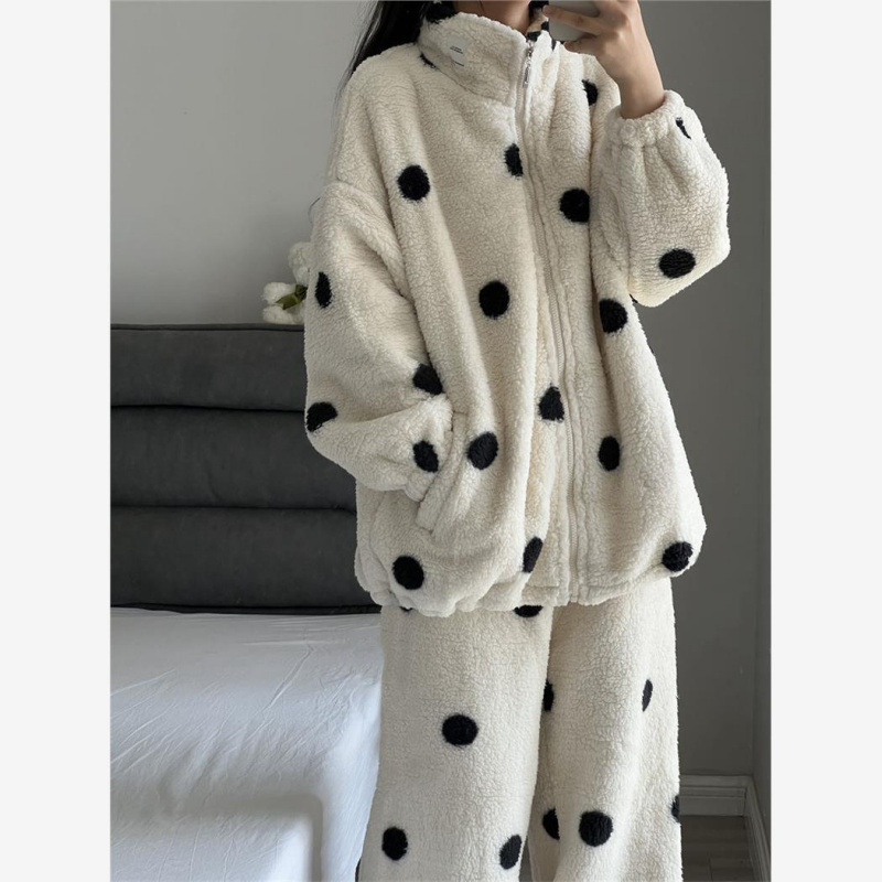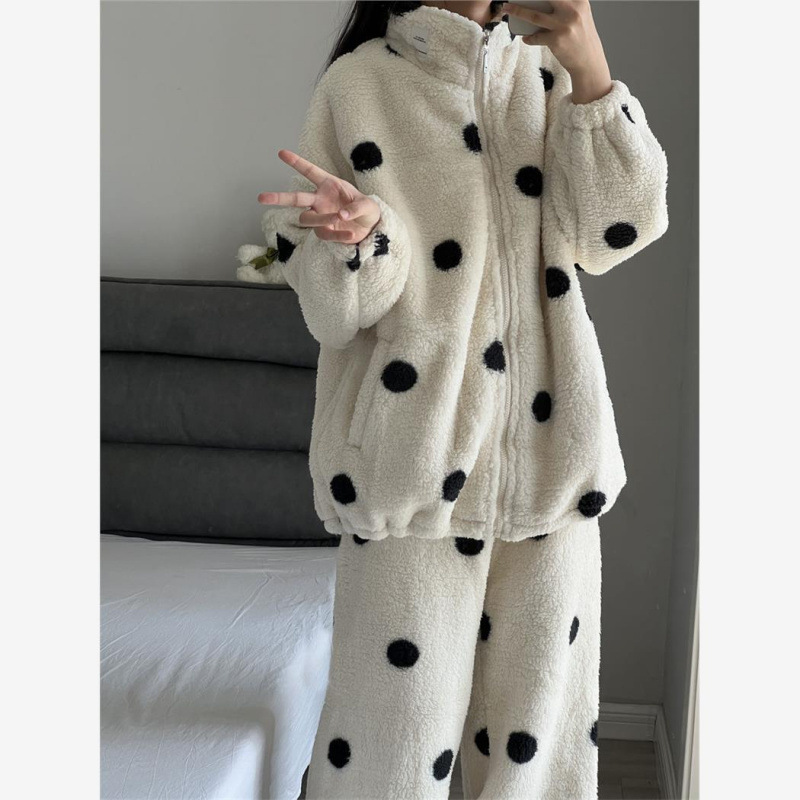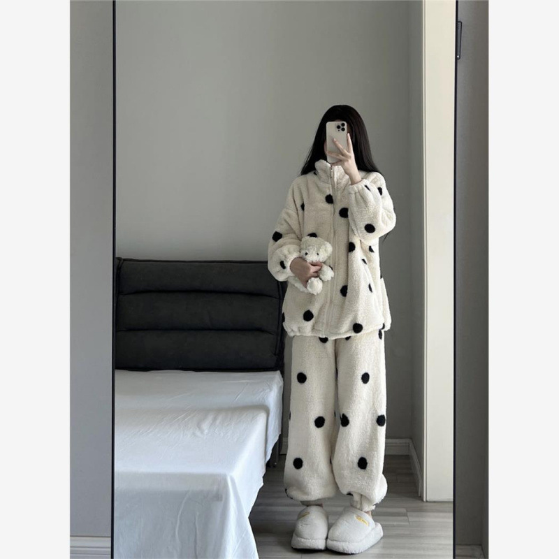 可爱波点睡衣女秋冬季珊瑚绒加厚拉链高领法兰绒家居服套装可外穿
