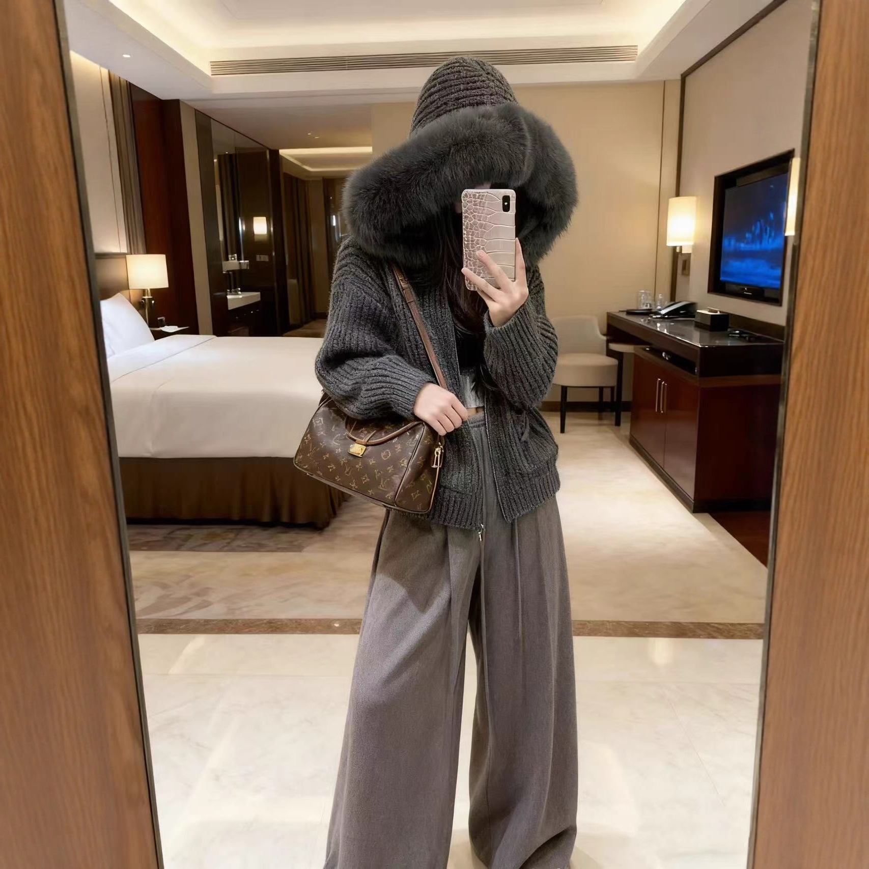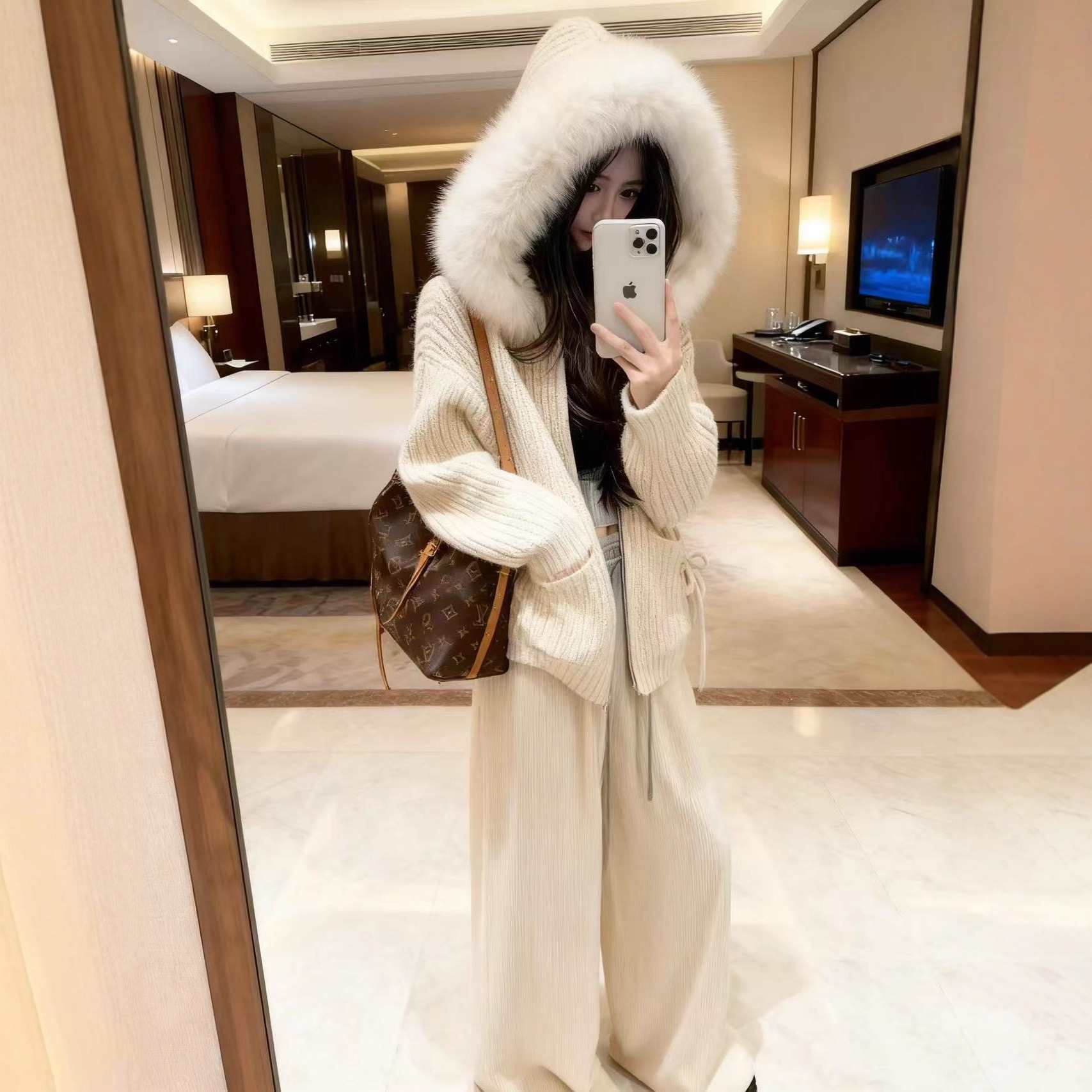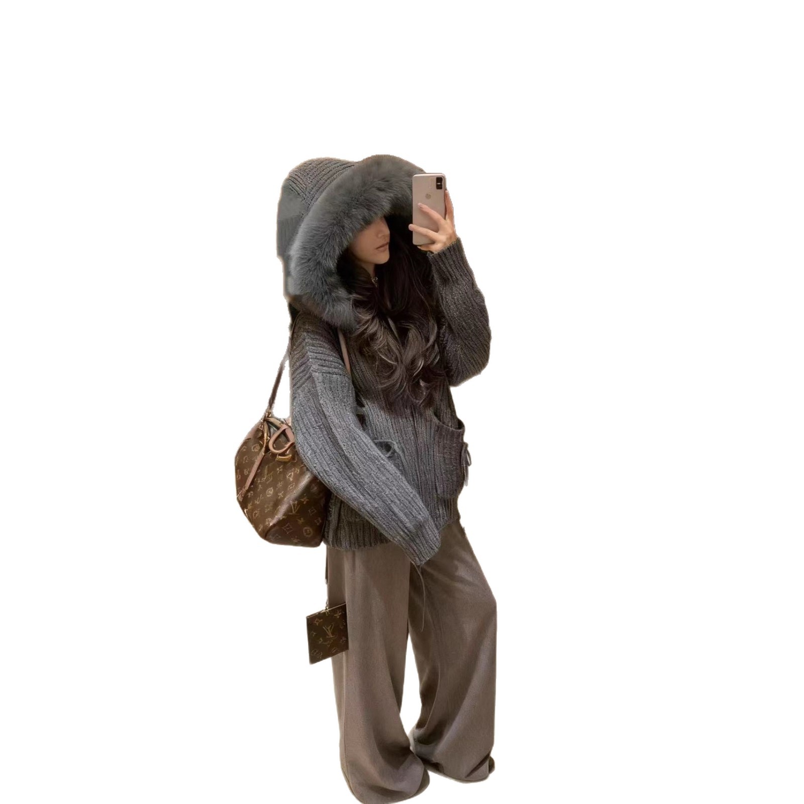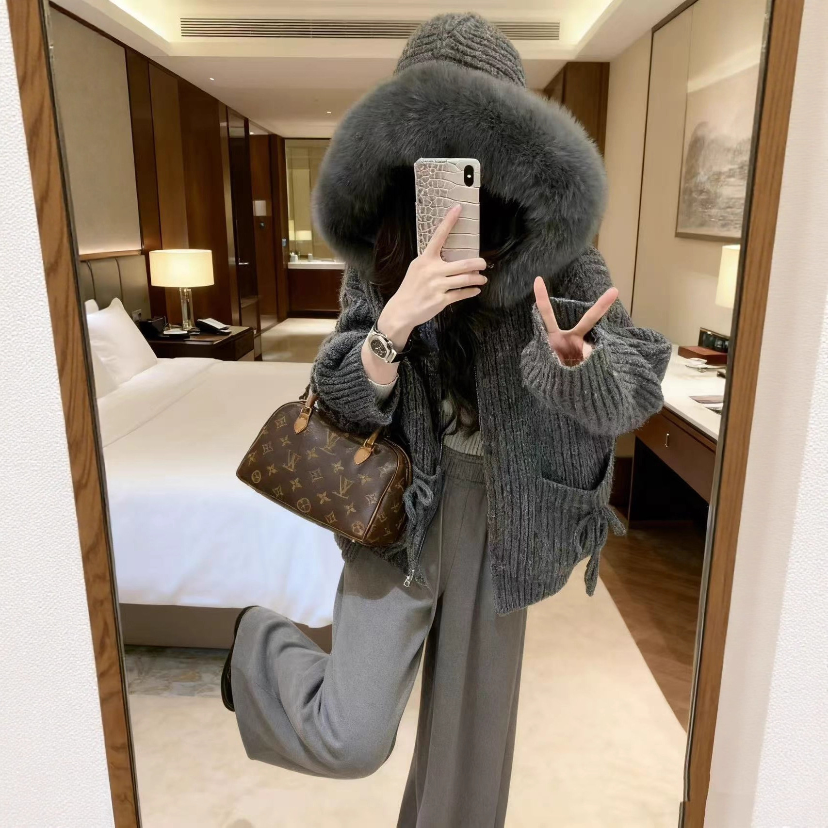 韩国chic秋冬新款感羊羔绒连帽针织开衫女慵懒风软糯保暖毛衣