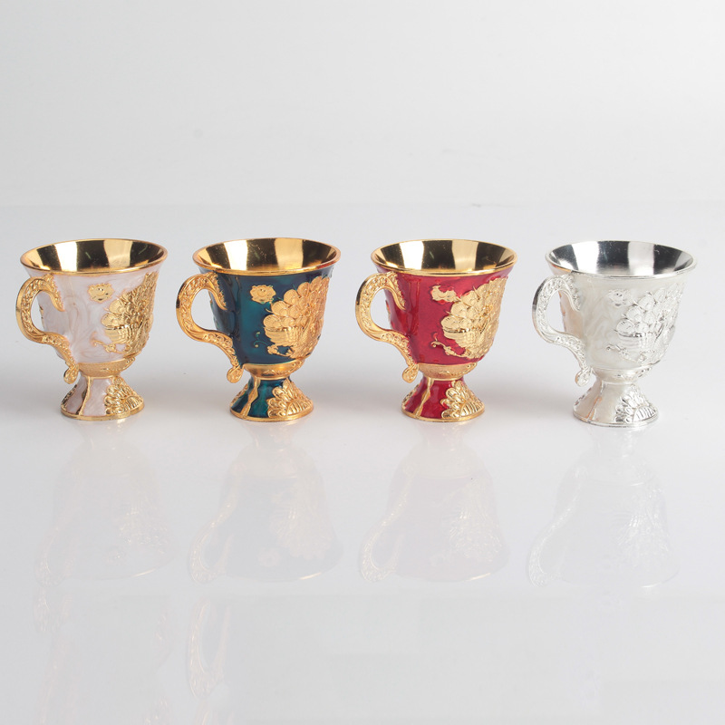 | 规格尺寸 | 欧式高端孔雀把手杯金白底 | 规格尺寸 | 欧式高端孔雀把手杯金大红底 |