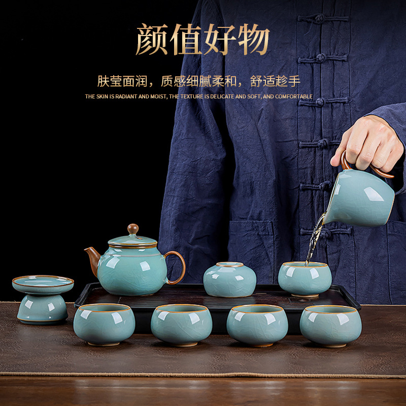 规格 | 10头天青汝窑套装(将军壶) | | 规格 | 10头天青汝窑(提壶)6罗汉杯 |