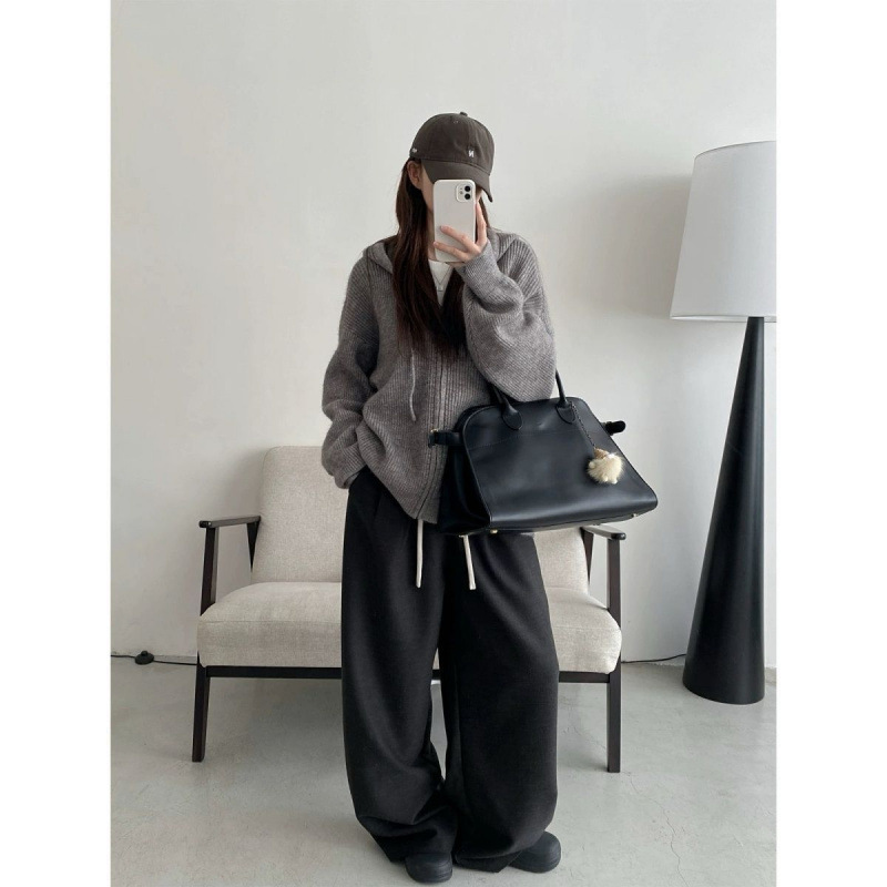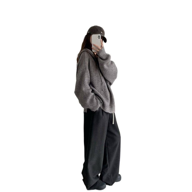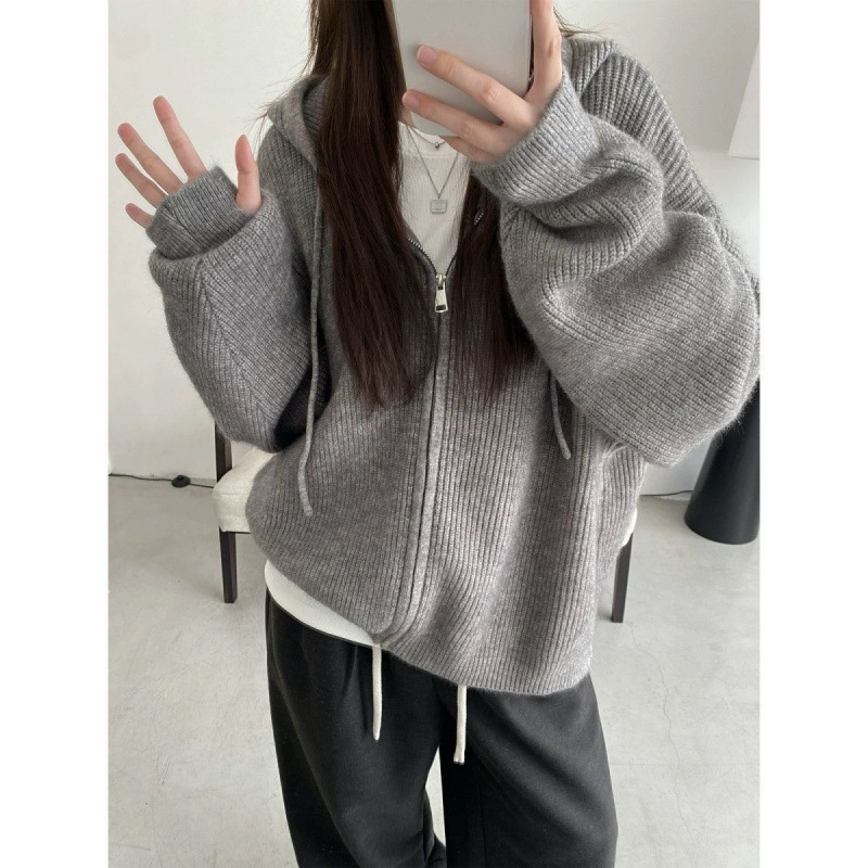 韩系慵懒风气质连帽抽绳内搭毛衣外套女秋冬休闲软糯拉链针织开衫