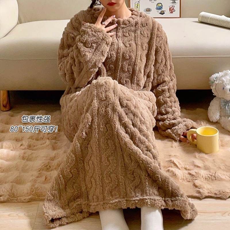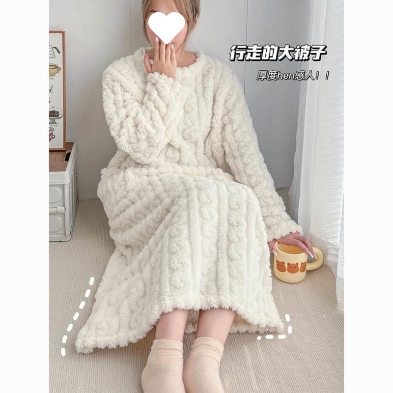 行走的大被子瑚绒绒提花长款宽松有口袋家居睡袍睡裙女冬季睡衣