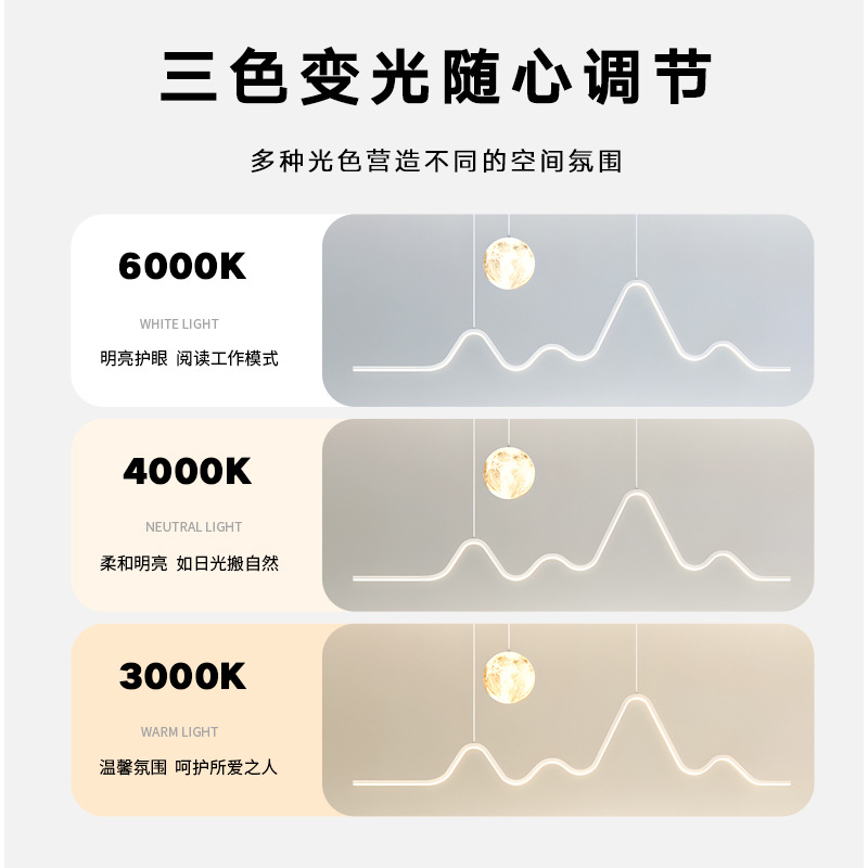 灯光颜色 | 白色120cm山月餐吊+支持天猫精灵 | | 灯光颜色 | 黑色120cm山月餐吊+三色变光 |