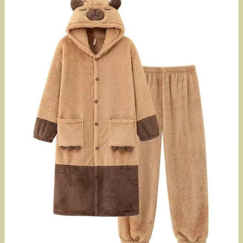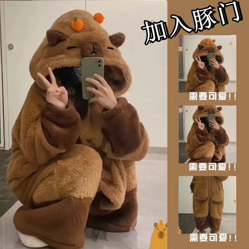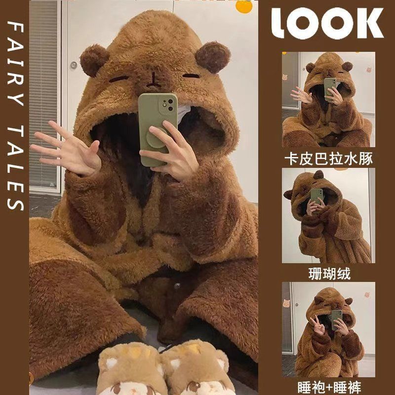卡皮巴拉睡衣女秋冬可爱卡通珊瑚绒长款保暖加绒加厚睡袍可外穿