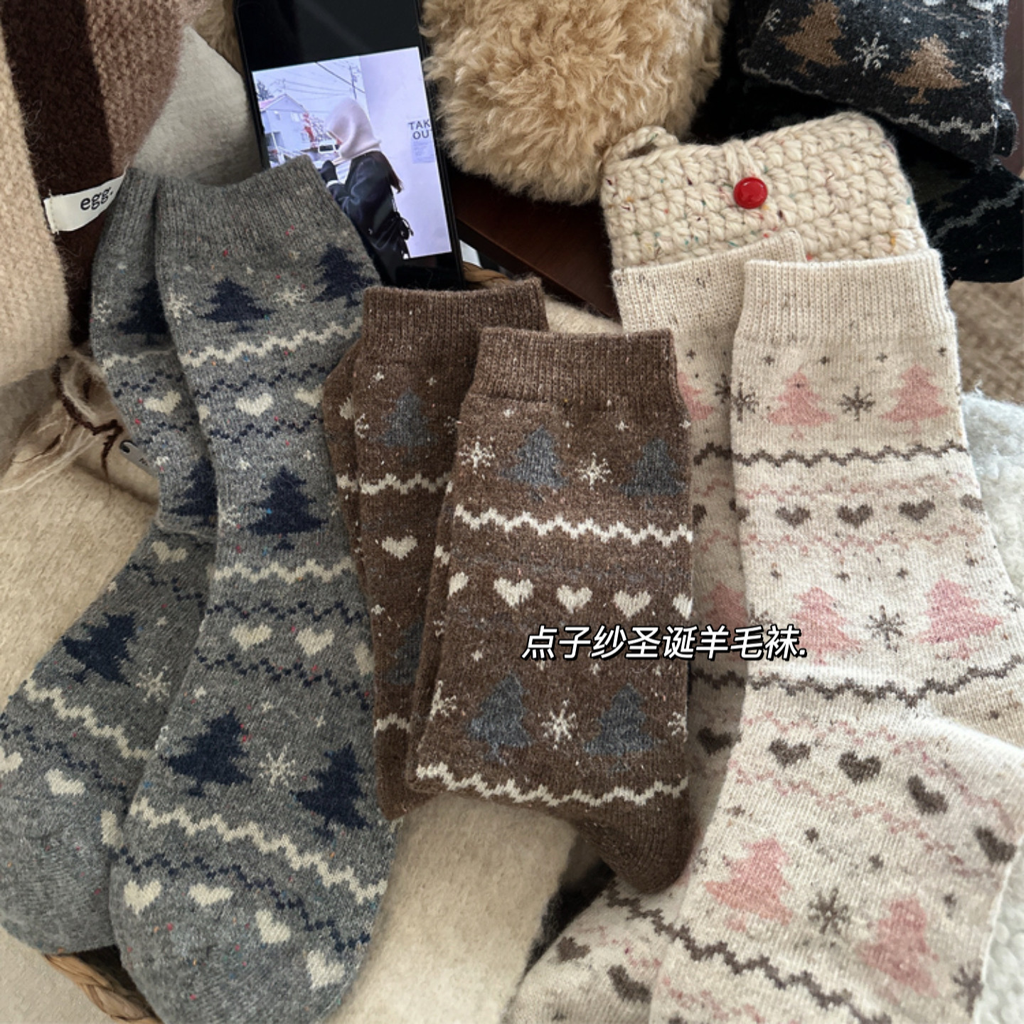 冬天加厚袜子保暖羊毛中筒袜点子小红书同款圣诞树日系堆堆袜女袜