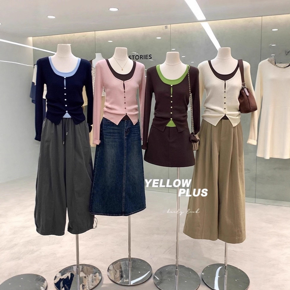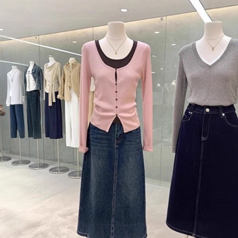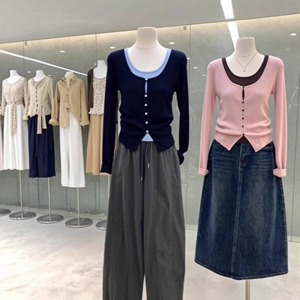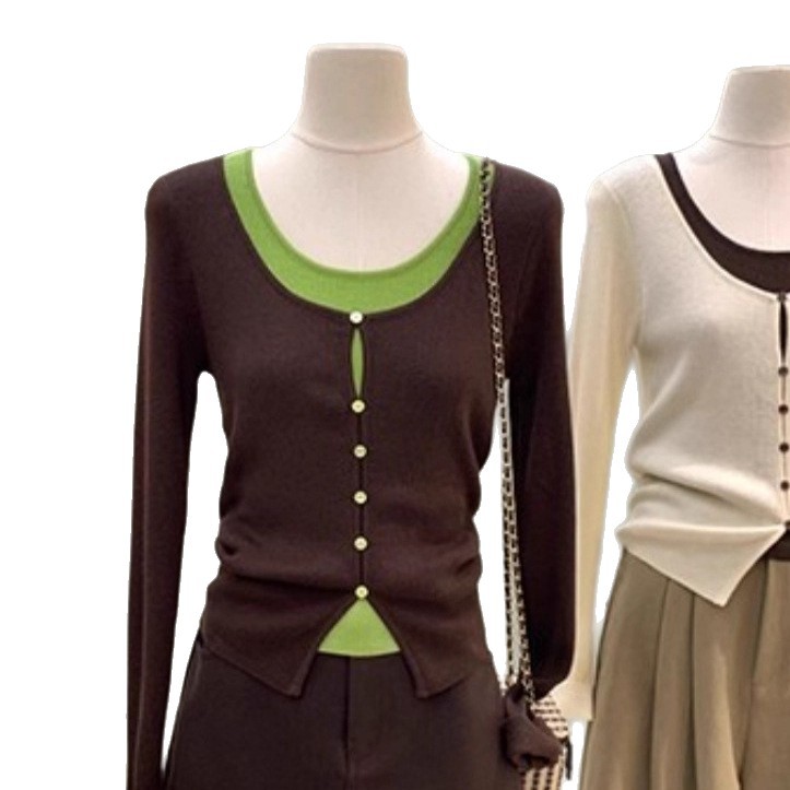韩系欧尼温柔感假两件撞色针织衫2025款修身显瘦独特漂亮早秋上衣