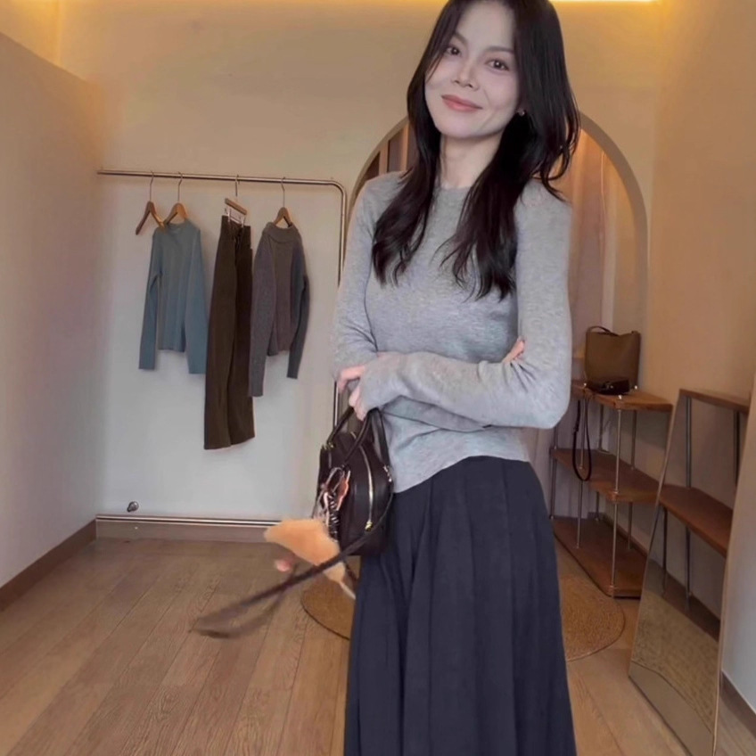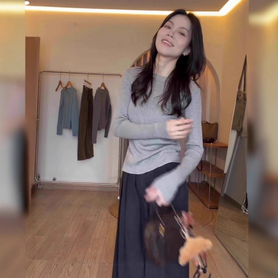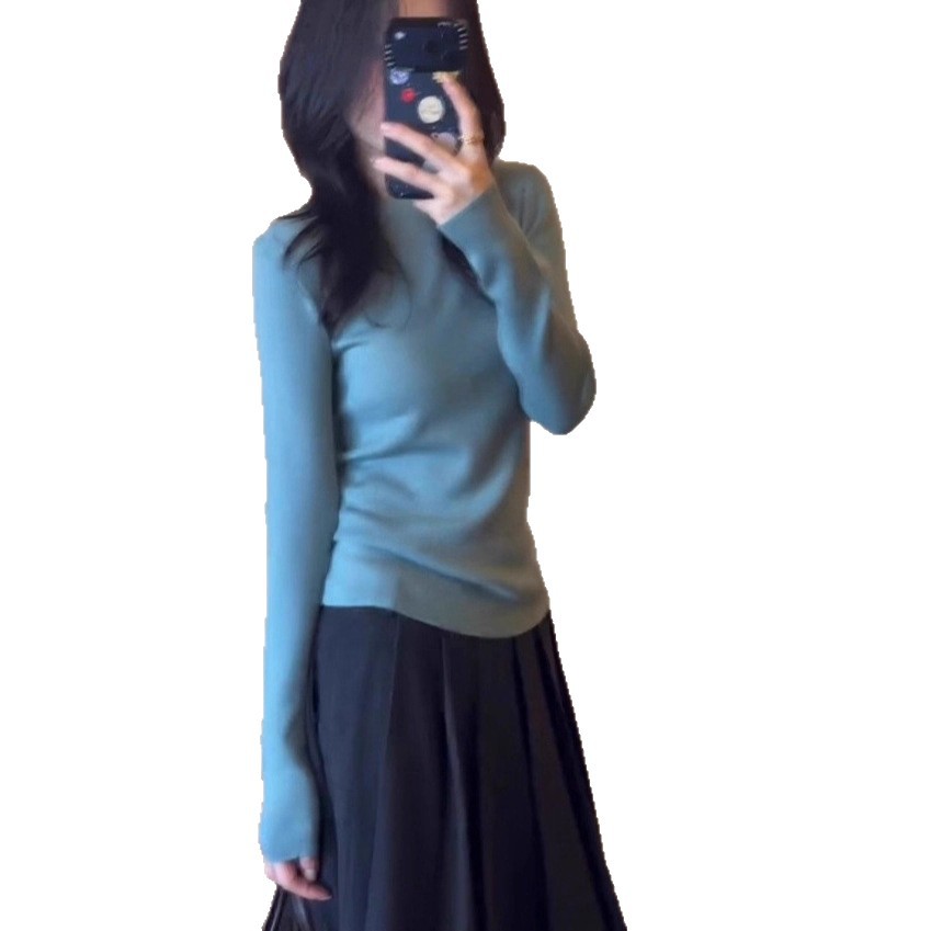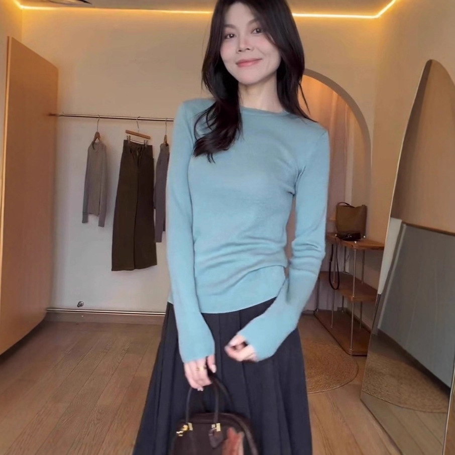 温柔系凡尔赛蓝色圆领长袖针织衫女早秋季小个子修身内搭打底上衣