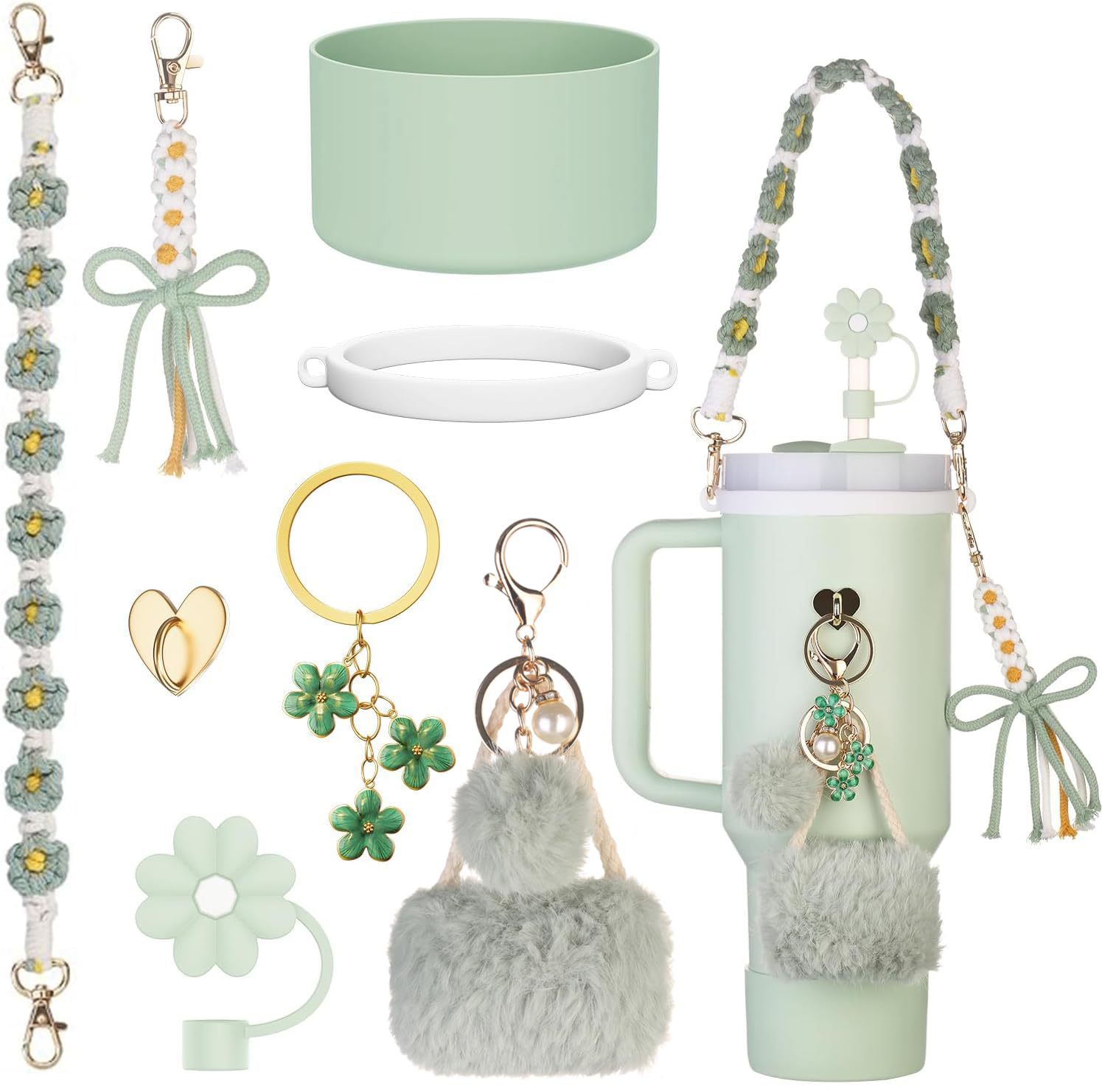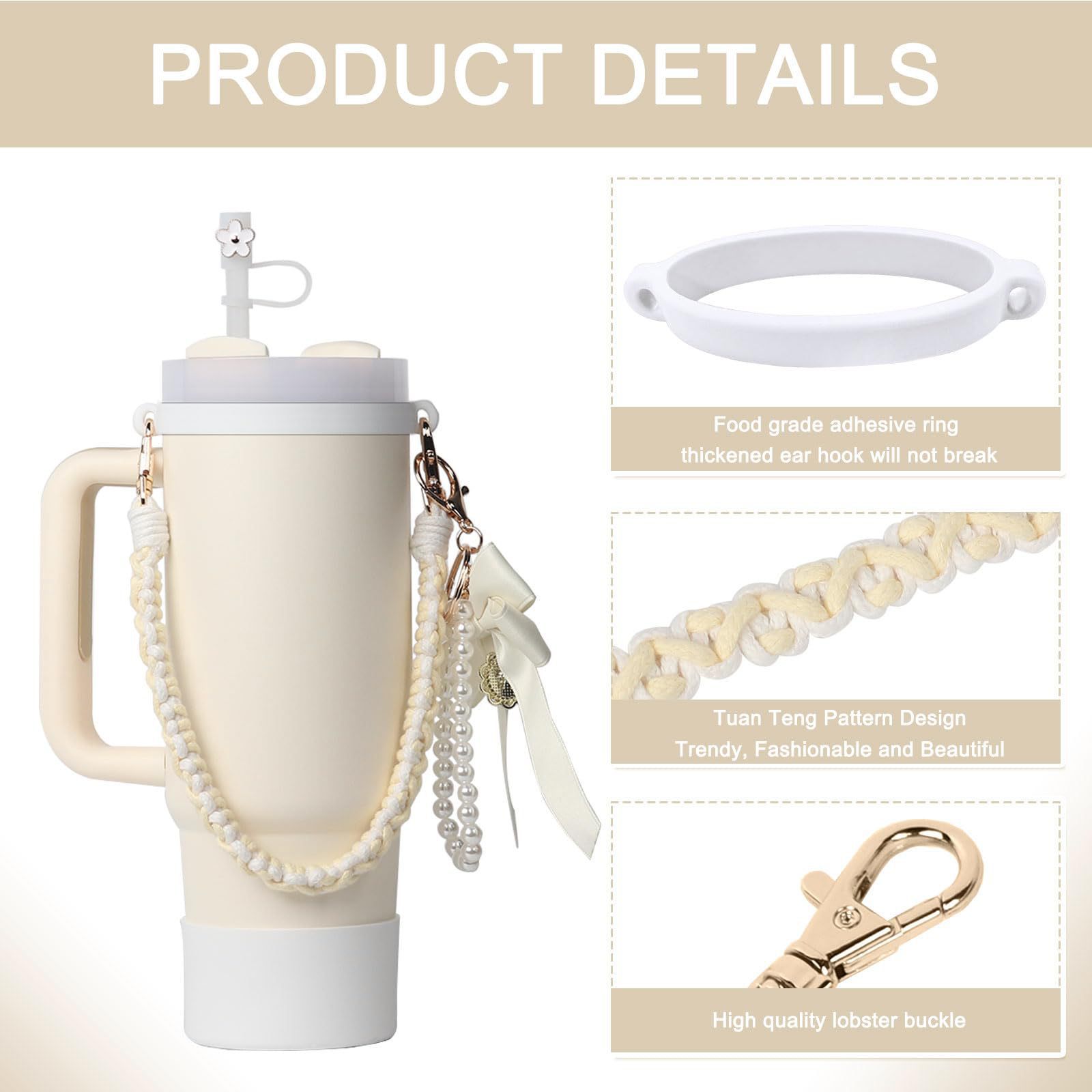 花朵钥匙扣套手提蝴蝶结吸管硅胶杯Stanley小香风挂绳帽珍珠杯链