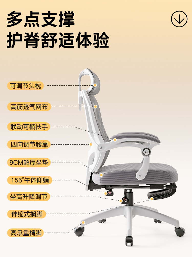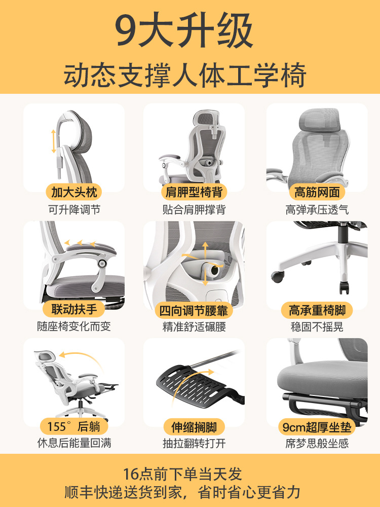 颜色 | 【冲量款】白框灰-四级气杆-带搁脚-9CM加厚乳胶坐垫-α悬浮腰托-135°可躺 | | 颜色 | 升级坐深50cm,学会对比尺寸,高矮胖瘦都合适哦 |