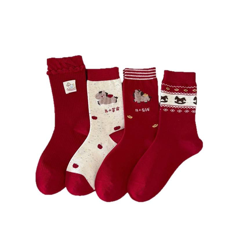 马上平安红色费尔岛圣诞袜子女棉质中筒堆堆袜新年本命年大红袜子