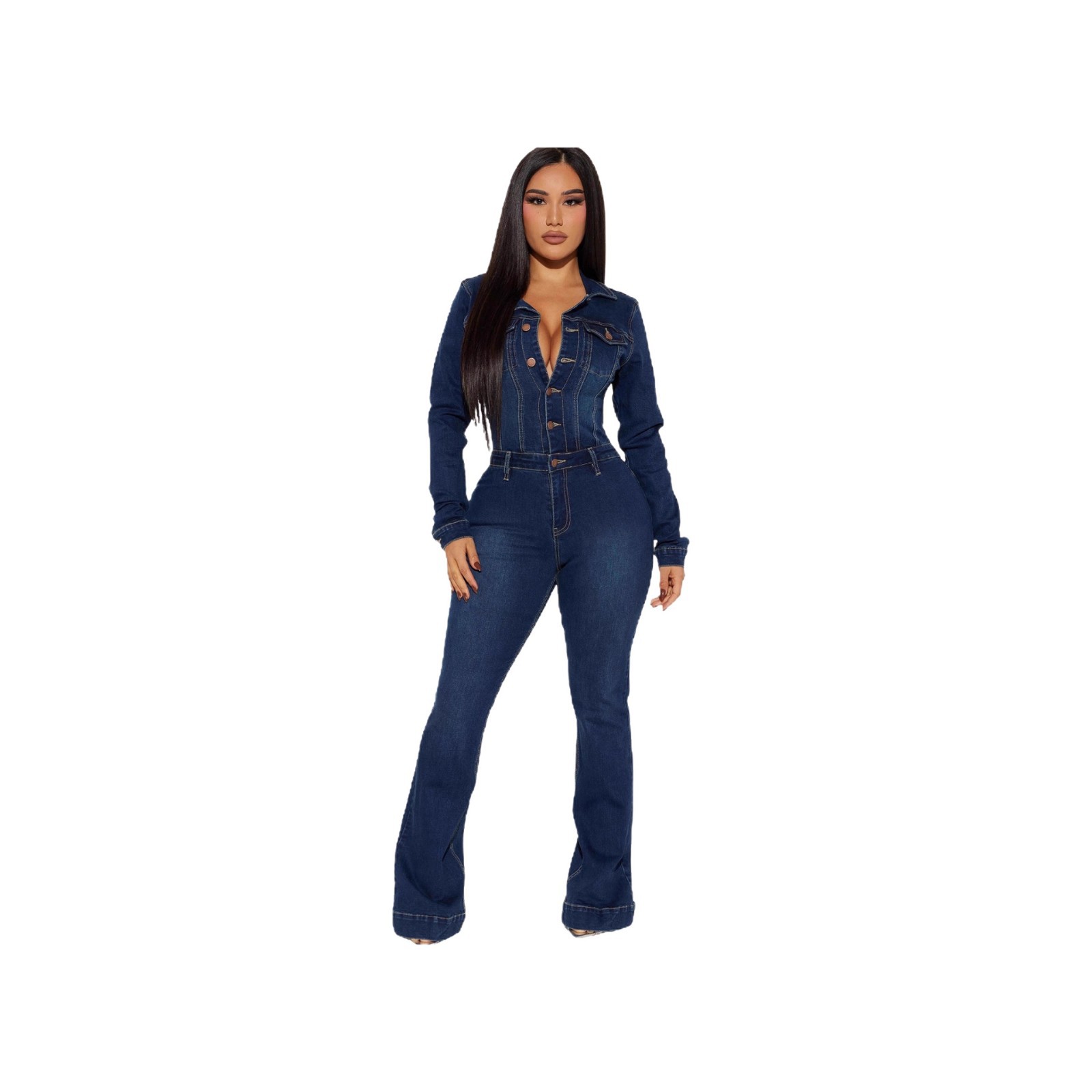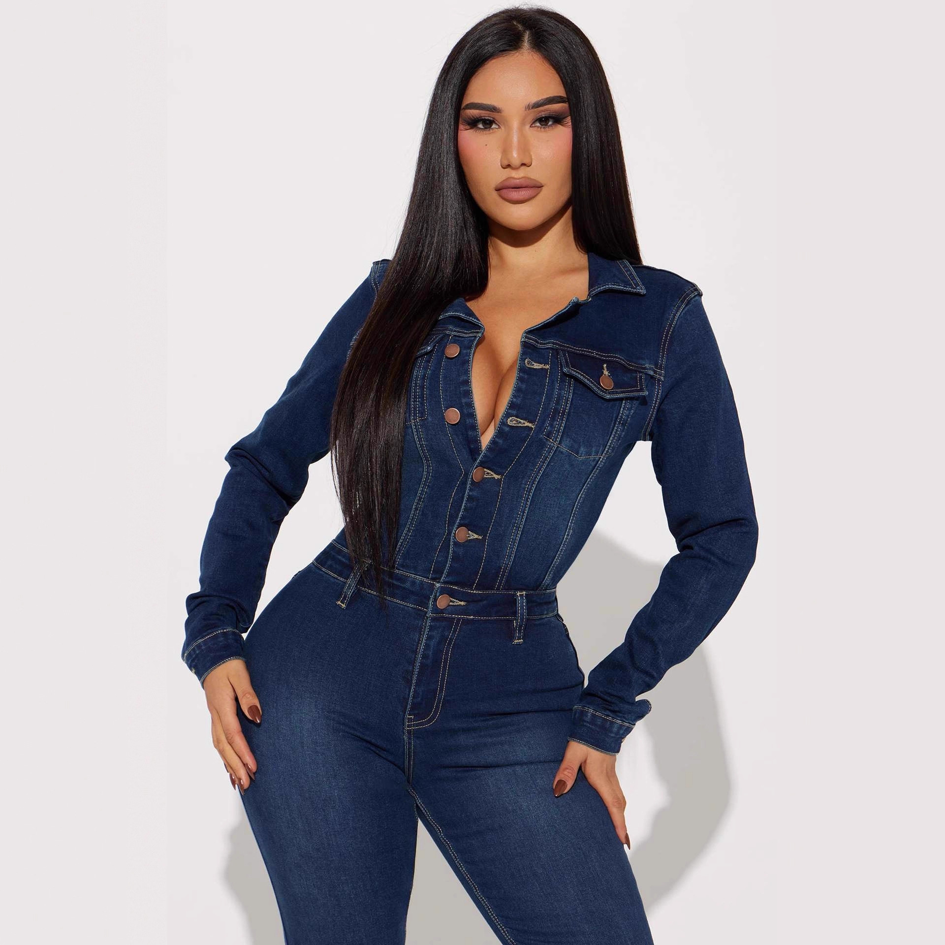 欧美亚马逊修身弹力喇叭口时尚修身长袖牛仔连体裤跨境女装