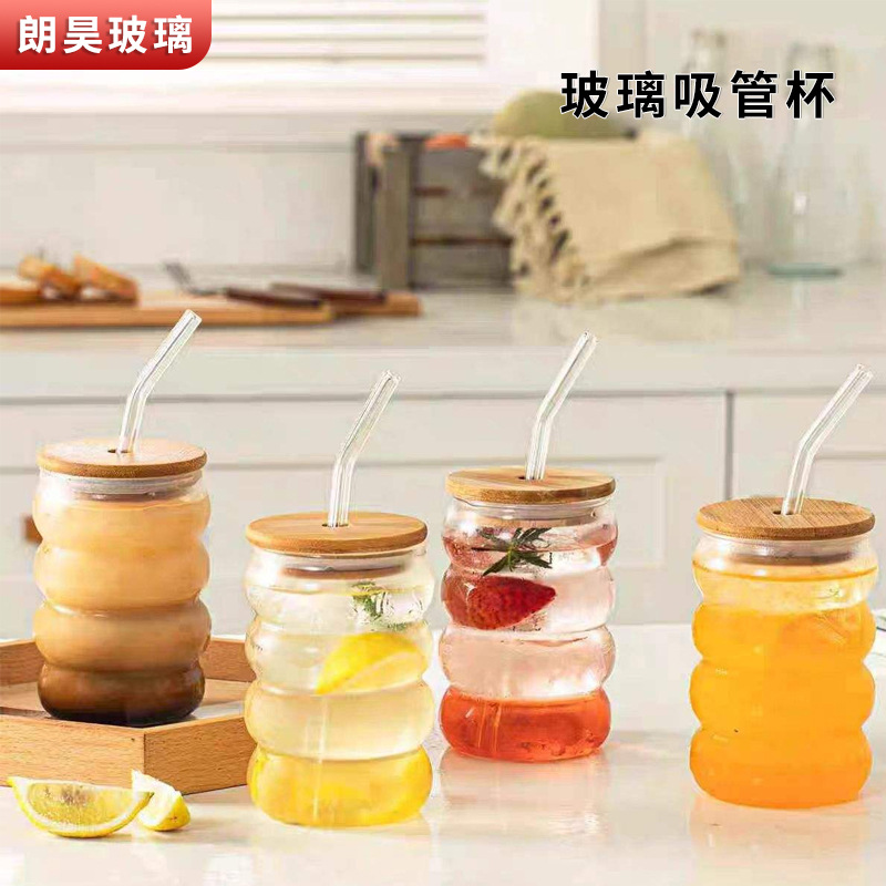 圈圈杯带盖高硼硅玻璃杯加厚果汁饮料杯带吸管毛毛虫杯奶茶杯子