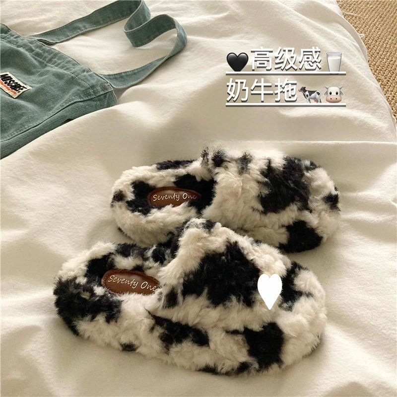 重工高级感~厚实INS小众奶牛毛毛拖鞋冬季厚底增高外穿一字棉拖鞋
