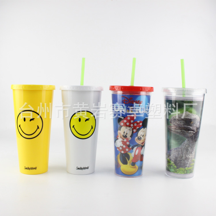 双层吸管杯卡通印花吸管杯PS环保吸管杯圆吸管杯可加印logo20oz