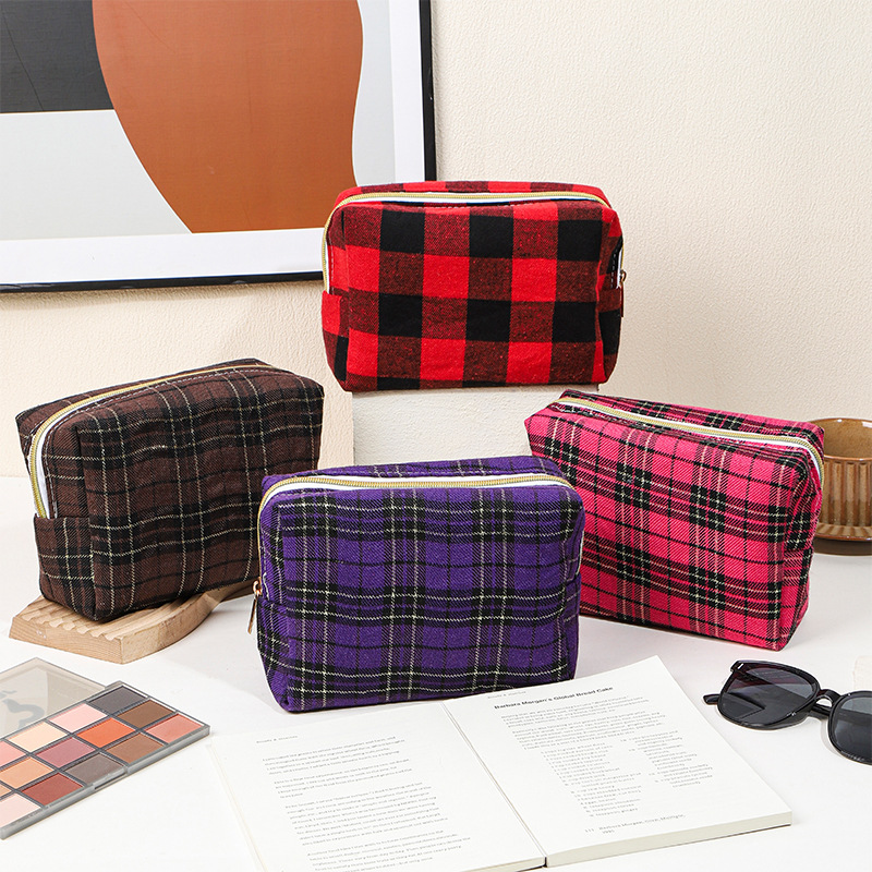 新款格子印花化妆包旅行护肤品收纳洗漱大容量便携手提包笔极简风