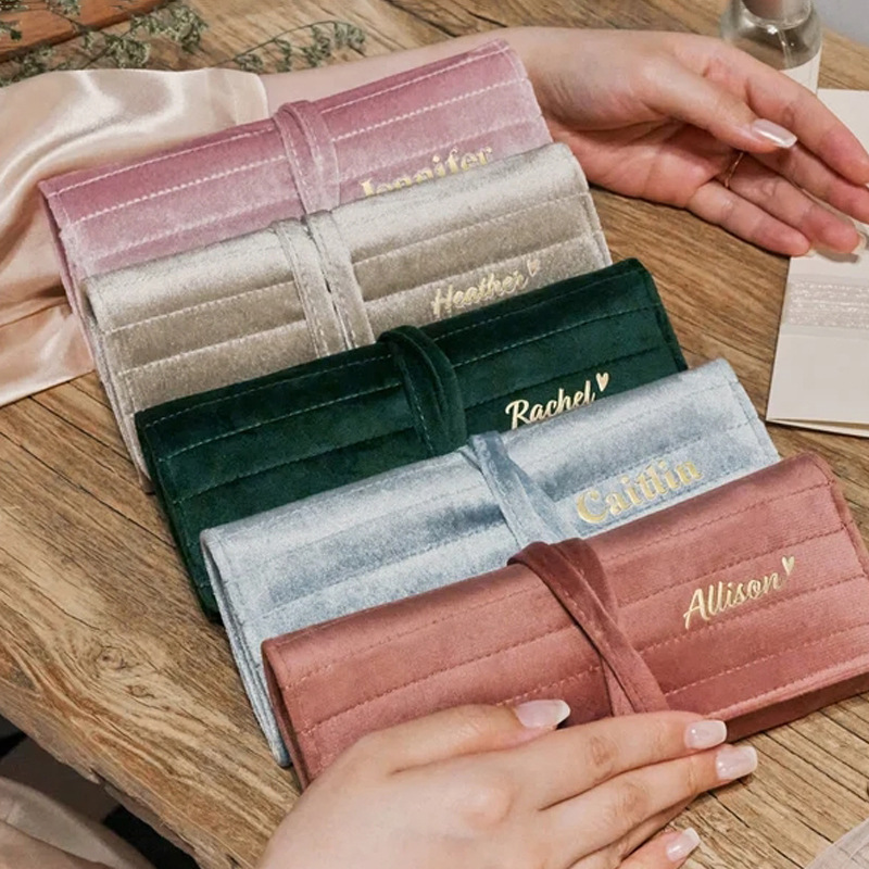 现货天鹅绒肤感首饰卷包便携绑带项链耳环戒指收纳包折叠首饰袋