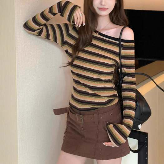 巨好看的一字肩条纹针织衫长袖秋季独特漂亮单穿早秋韩系穿搭上衣