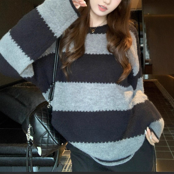 巨好看的早秋穿搭圆领长袖宽条纹针织衫女上衣慵懒高级感毛衣女潮