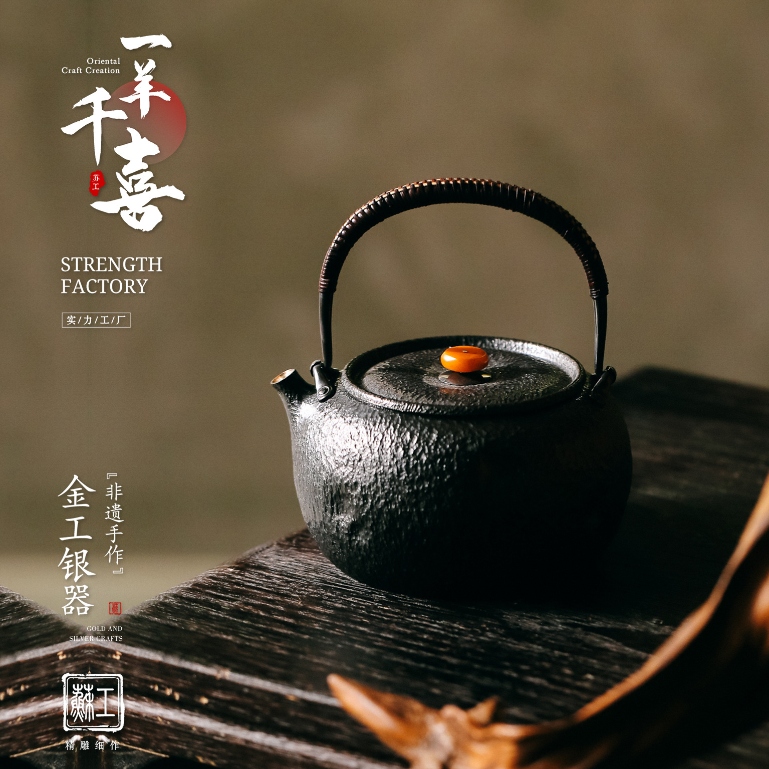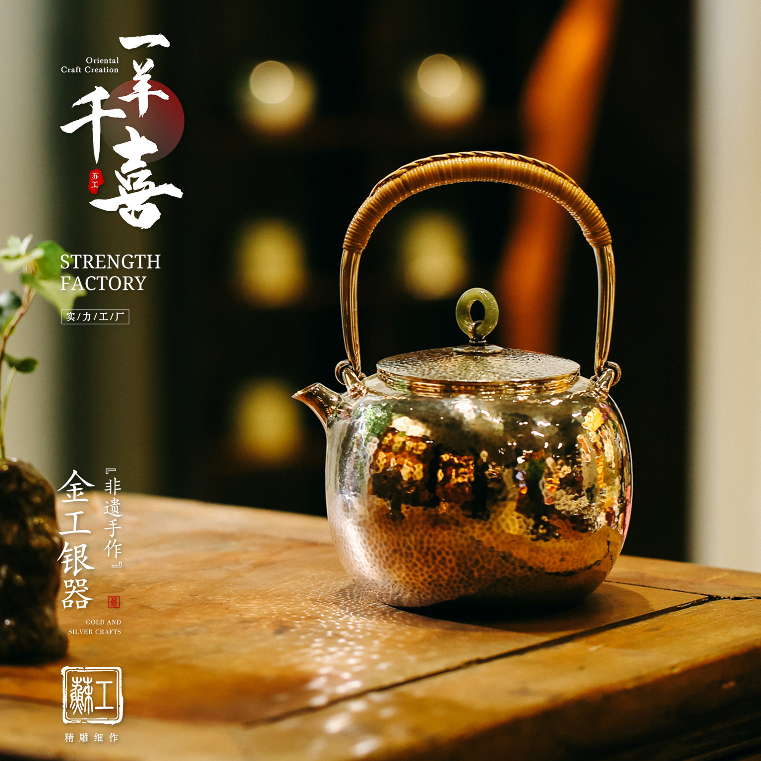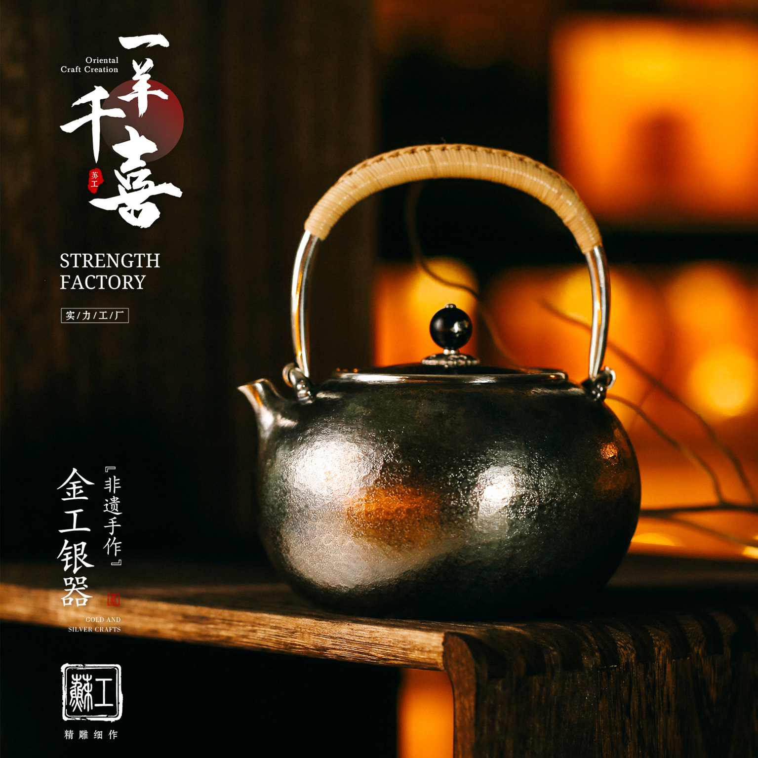 一张打提梁手工锤纹 银壶足银999烧水壶 养生泡茶壶提梁壶
