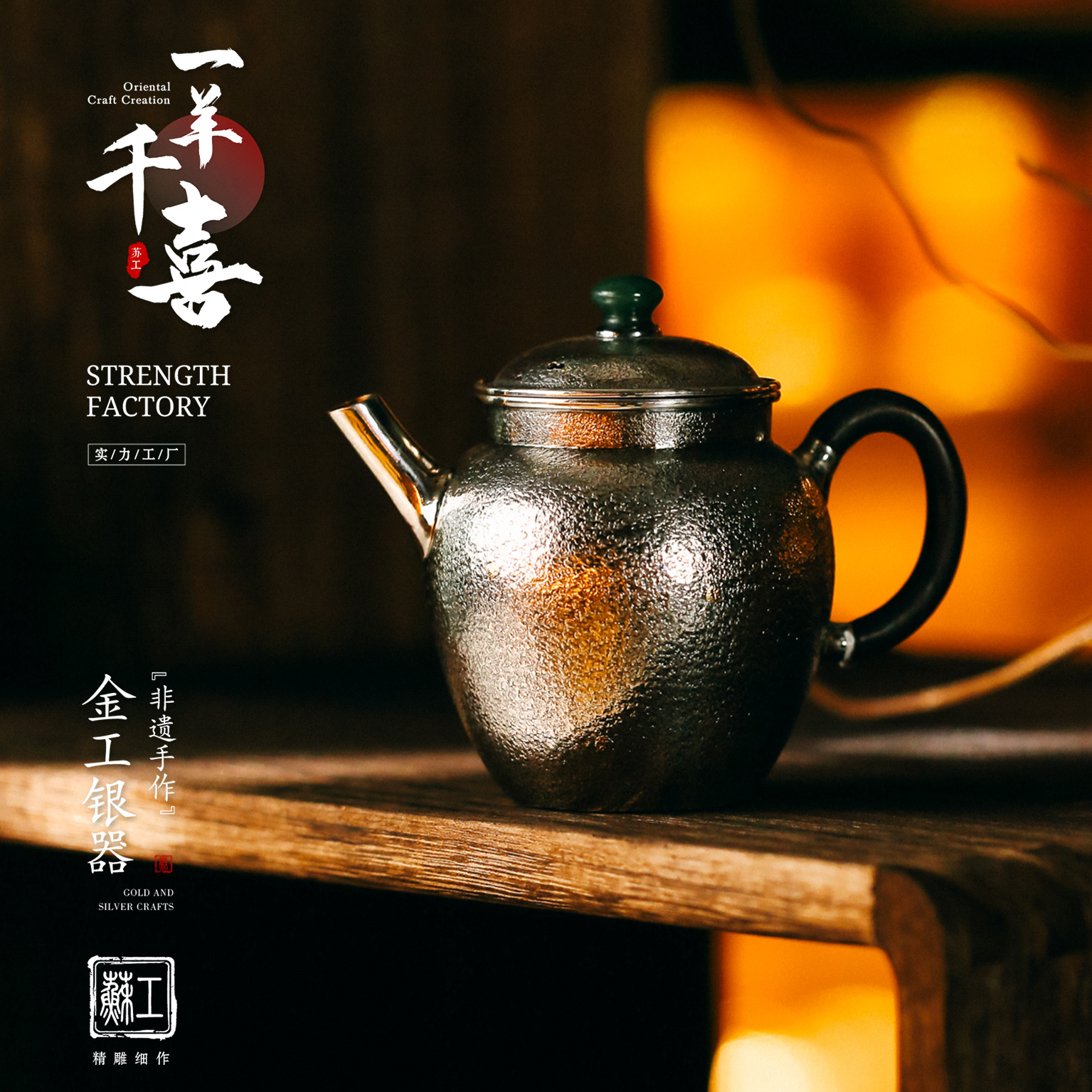 真锅静良中号石纹银壶 银壶足银999烧水壶 手工煮泡茶壶功夫茶具