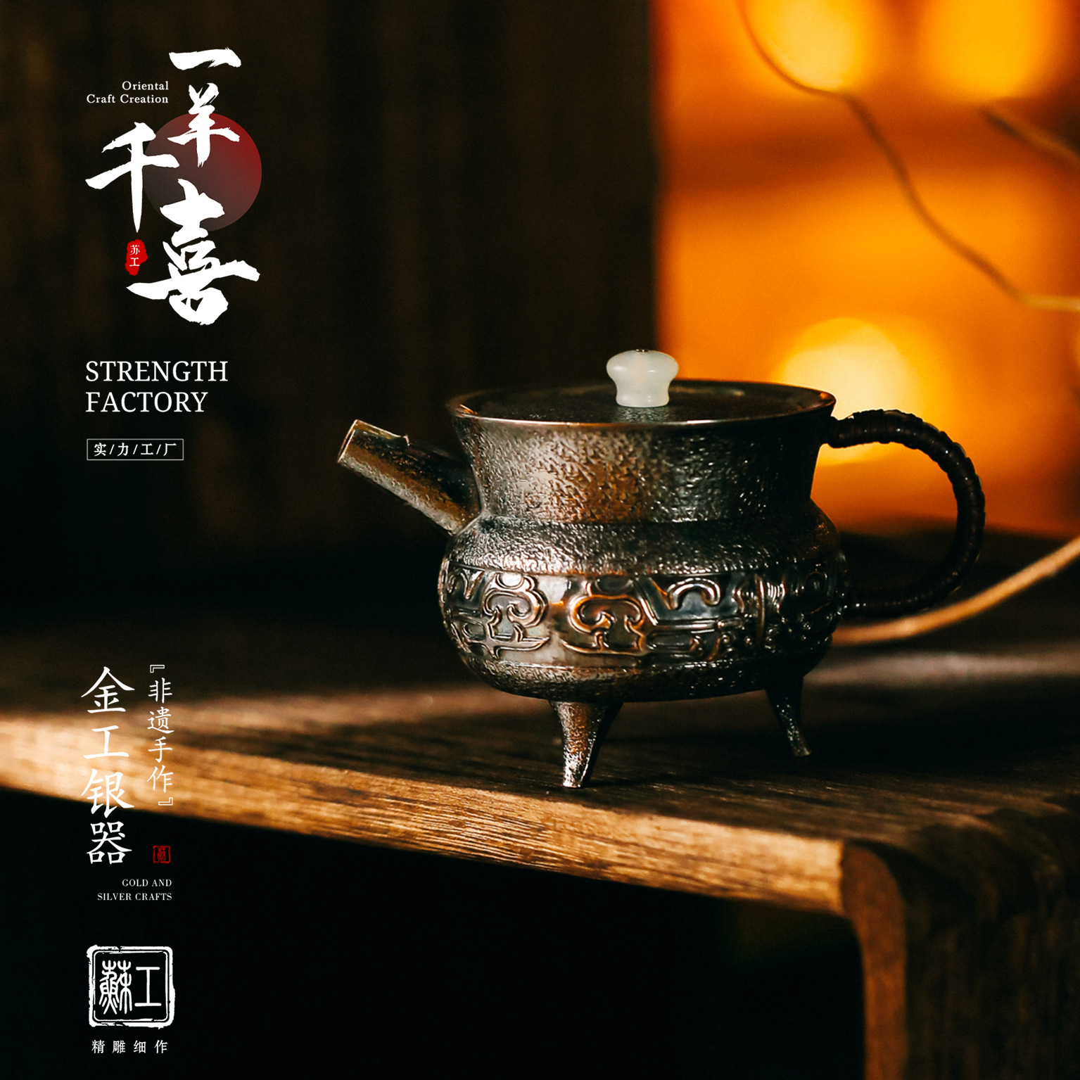 饕餮三足足银999泡茶壶纯手工仿古茶具苏工三足战汉仿青铜银壶