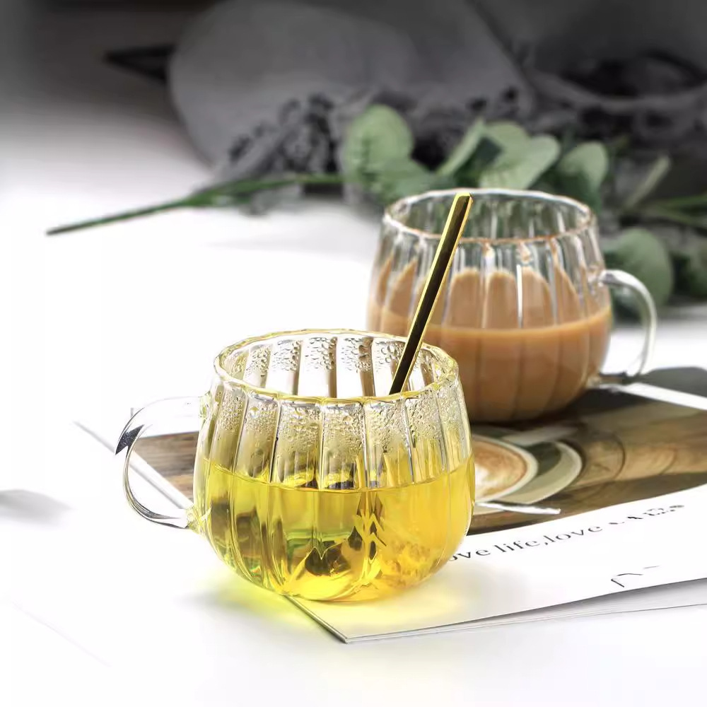 跨境泡沫包装 高硼硅玻璃竖条纹南瓜杯 带把手竖纹透明花瓣玻璃杯