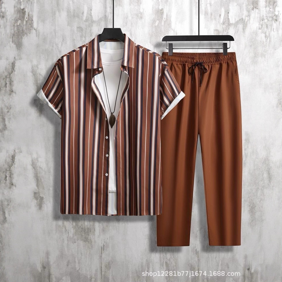 外贸欧美跨境男士夏威夷休闲时尚街头翻领纽扣短袖衬衫长裤套装夏