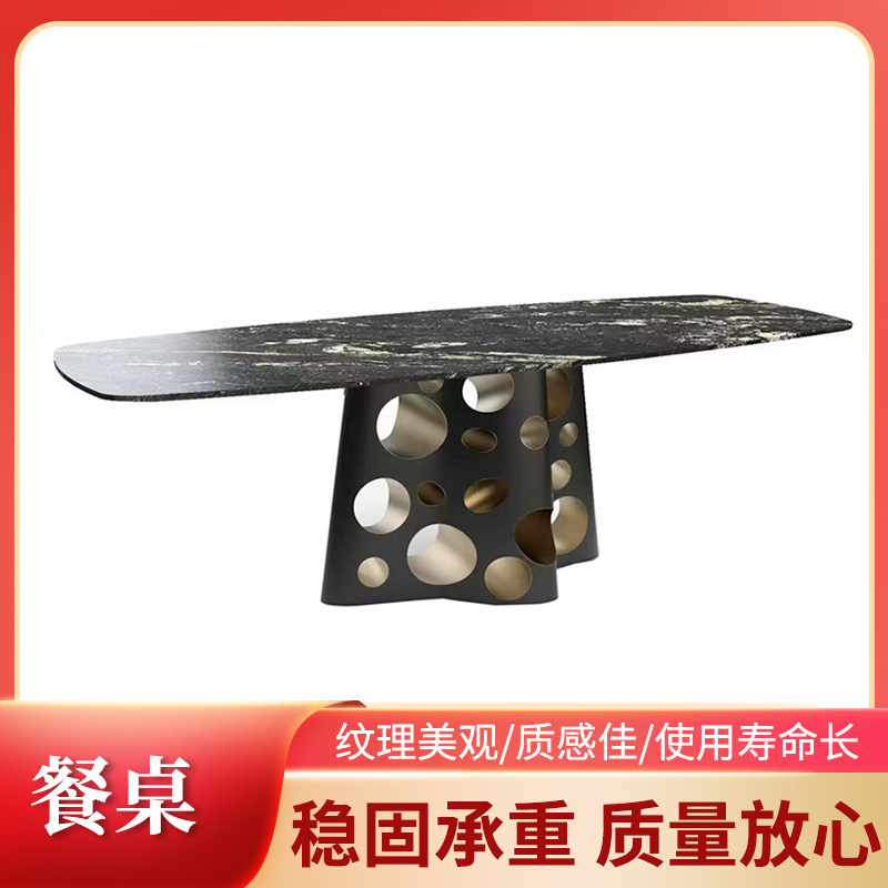 意式轻奢大理石餐桌别墅客厅创意设计双色奶酪餐桌金属方形餐桌