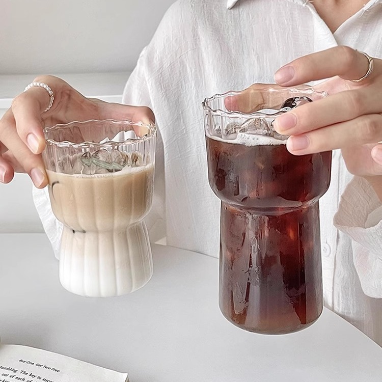 咖啡店小众复古竖纹透明玻璃水杯冰拿铁咖啡杯高硼硅单层玻璃杯
