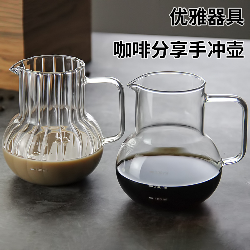 带刻度咖啡壶竖纹手冲壶咖啡分享壶过滤杯带把玻璃咖啡壶