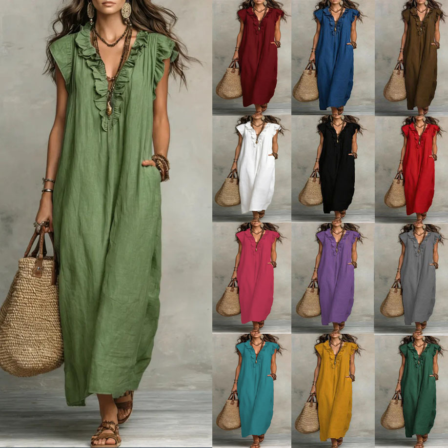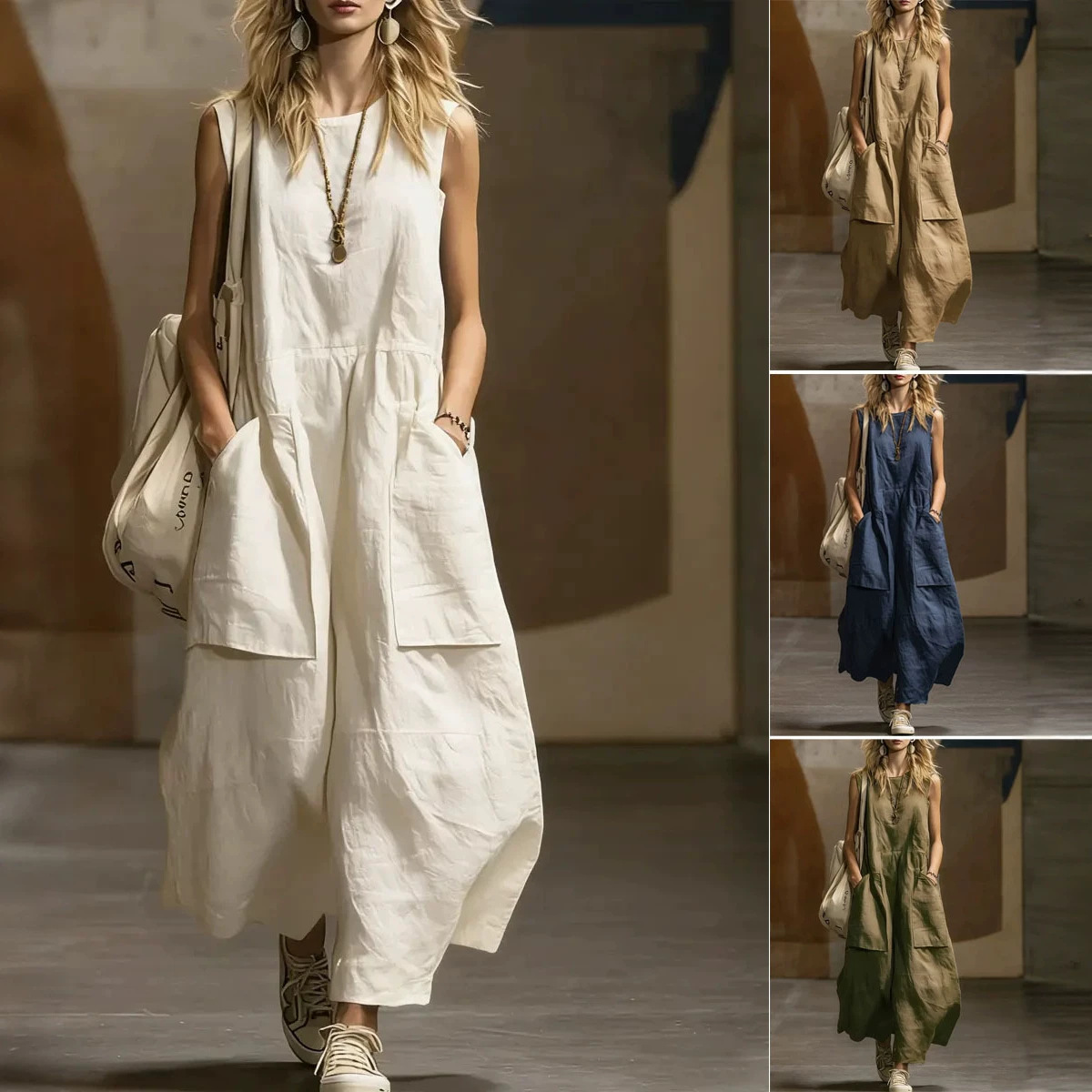 2026欧美夏季女装 宽松无袖棉麻长裙 休闲大口袋显瘦纯色新款连衣