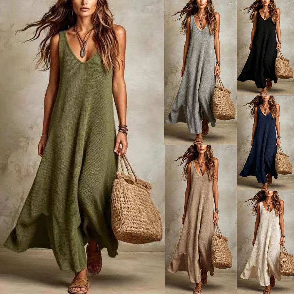 2026欧美风V领无袖针织连衣裙 宽松华夫格纹理度假风长款背心裙
