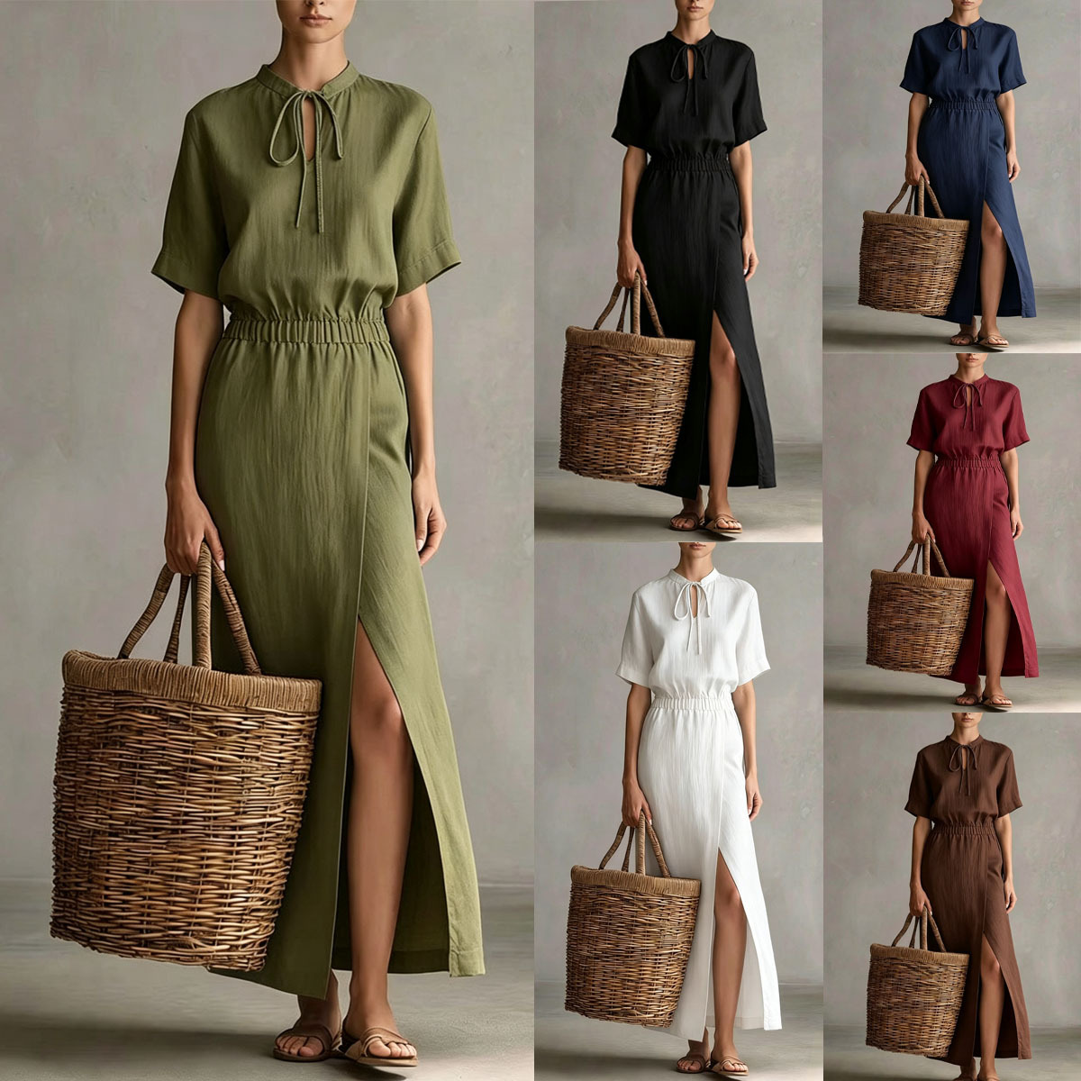 2026欧美风休闲短袖连衣裙 立领绑带收腰侧开叉度假长裙