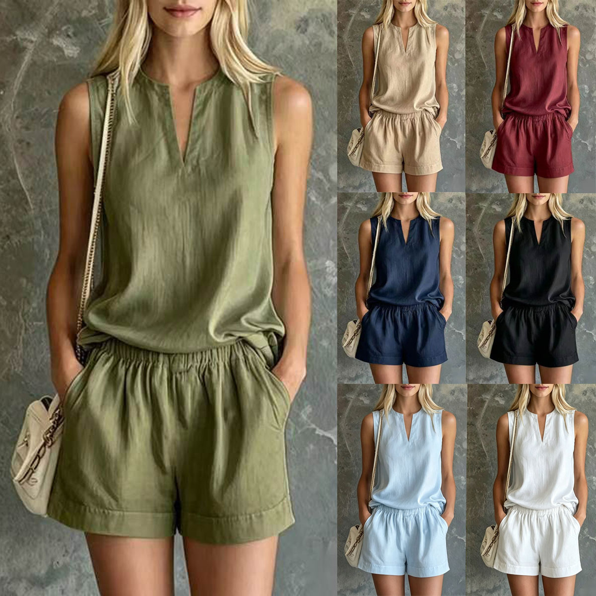 2026欧美夏季新款棉麻无袖上衣短裤两件套 休闲度假风V领套装女