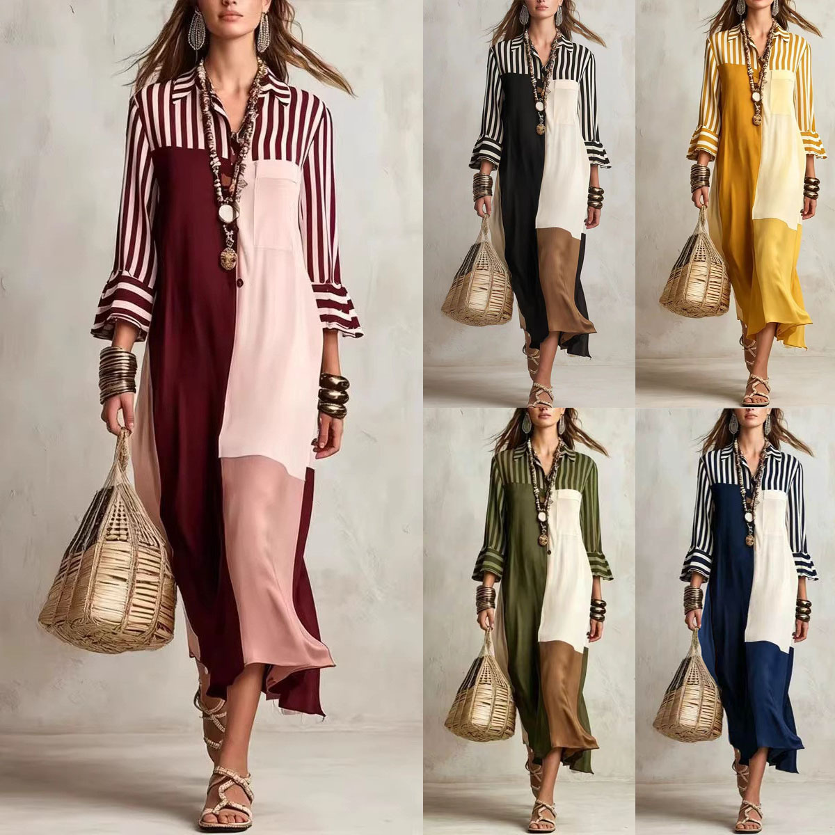 2026新款跨境爆款撞色条纹衬衫裙 波西米亚风宽松棉麻中长款连衣