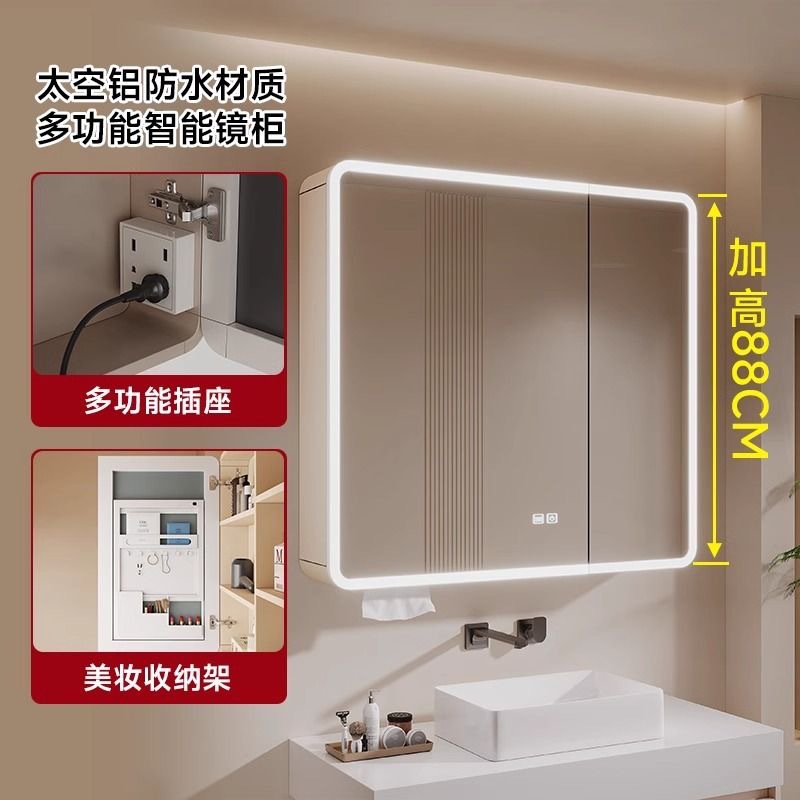 加高圆弧太空铝单独智能浴室镜柜带美妆架储物柜插座卫生间挂墙式