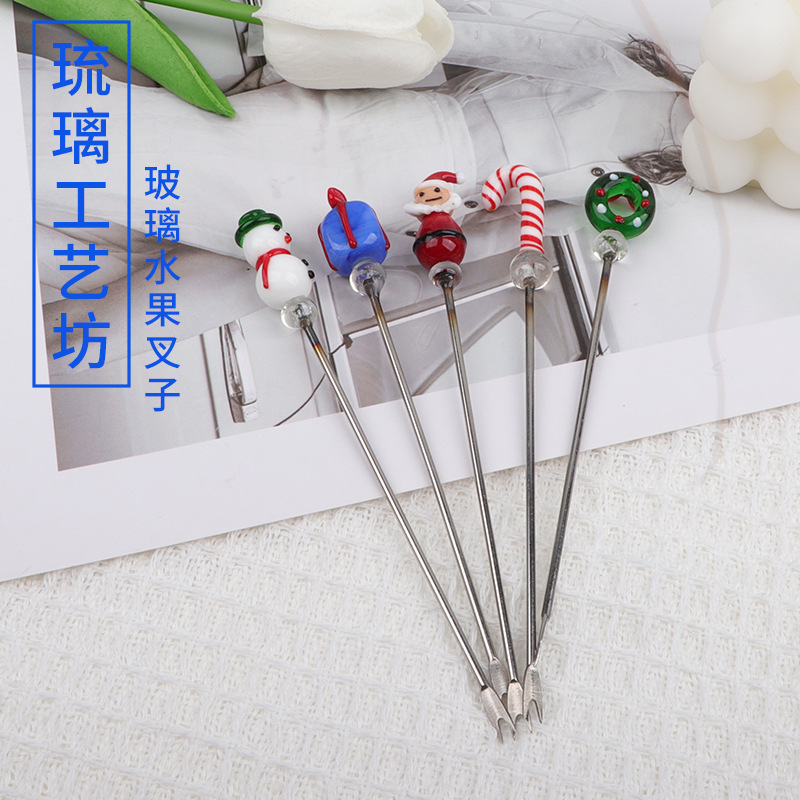 厂家批发玻璃水果叉子 圣诞风 仙人掌叉子 不锈钢长柄玻璃叉子