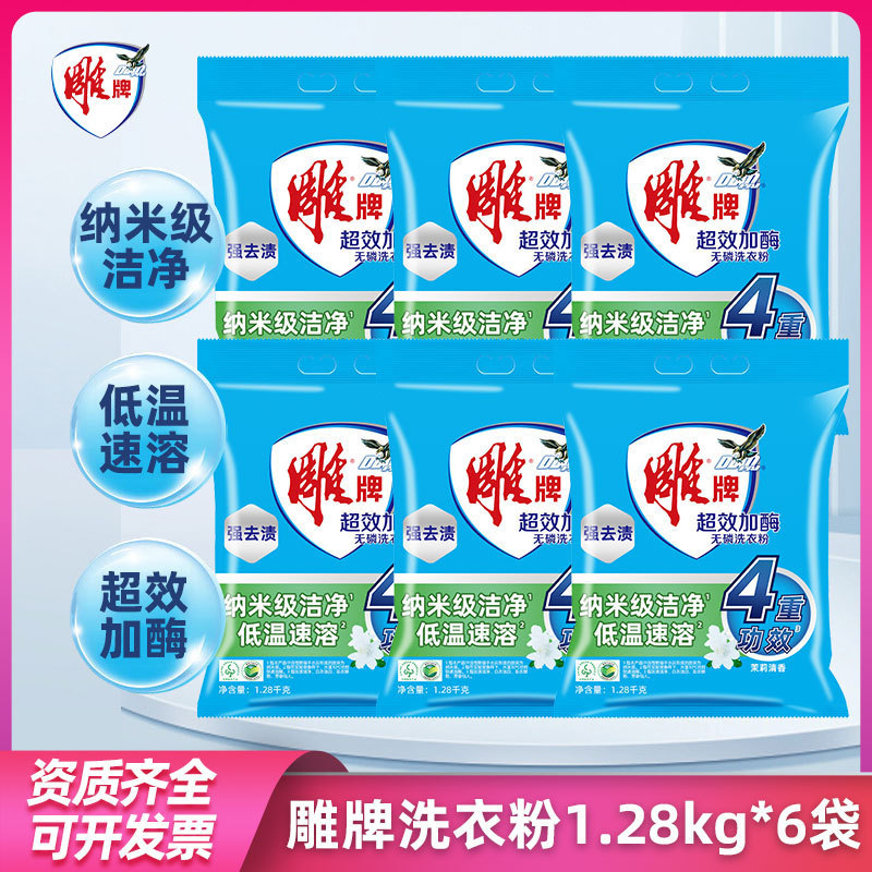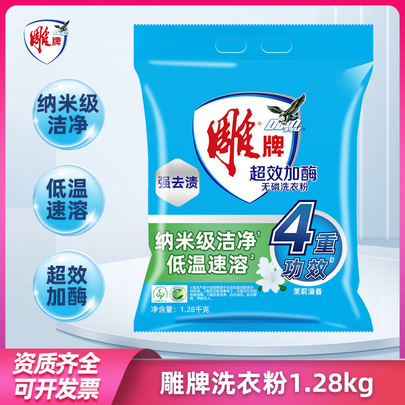 雕牌超效加酶无磷洗衣粉1.28kg袋装家用衣物去渍整箱批发加酶去渍