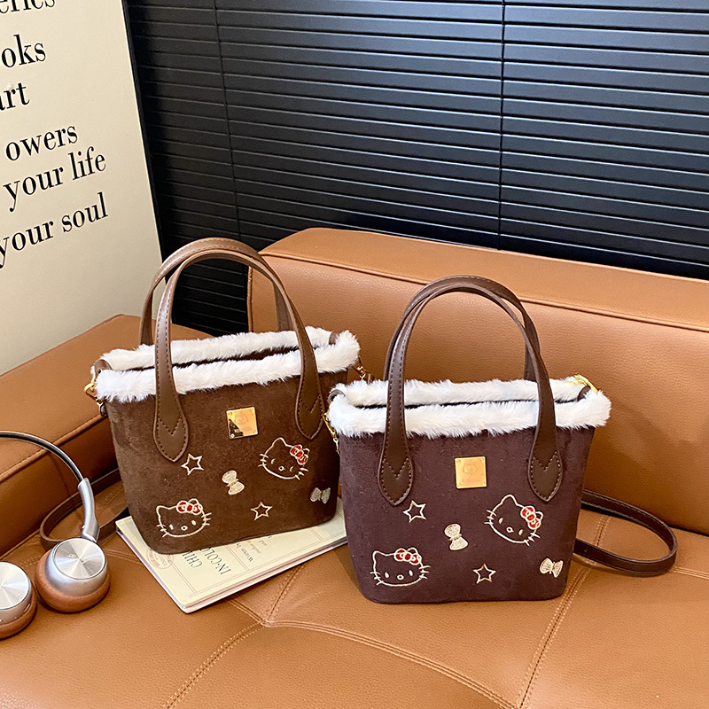 复古绒面小包包女秋冬季新款卡通刺绣单肩包毛绒绒手提斜挎水桶包
