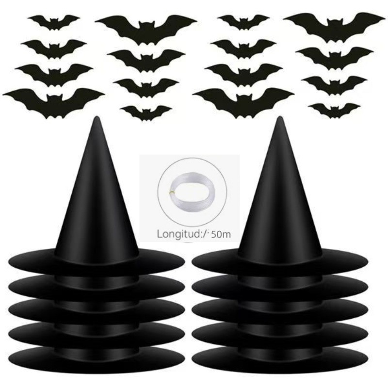 万圣节帽子巫婆派对装饰魔法师女巫帽黑尖巫师帽配鱼线和蝙蝠挂饰