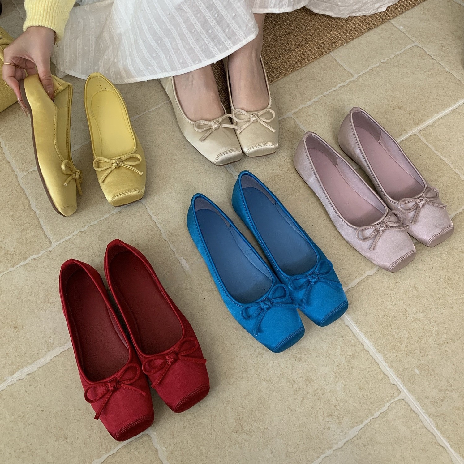 仙女风蝴蝶结绸缎方头浅口芭蕾舞单鞋女2025新款软底猪鼻小红鞋