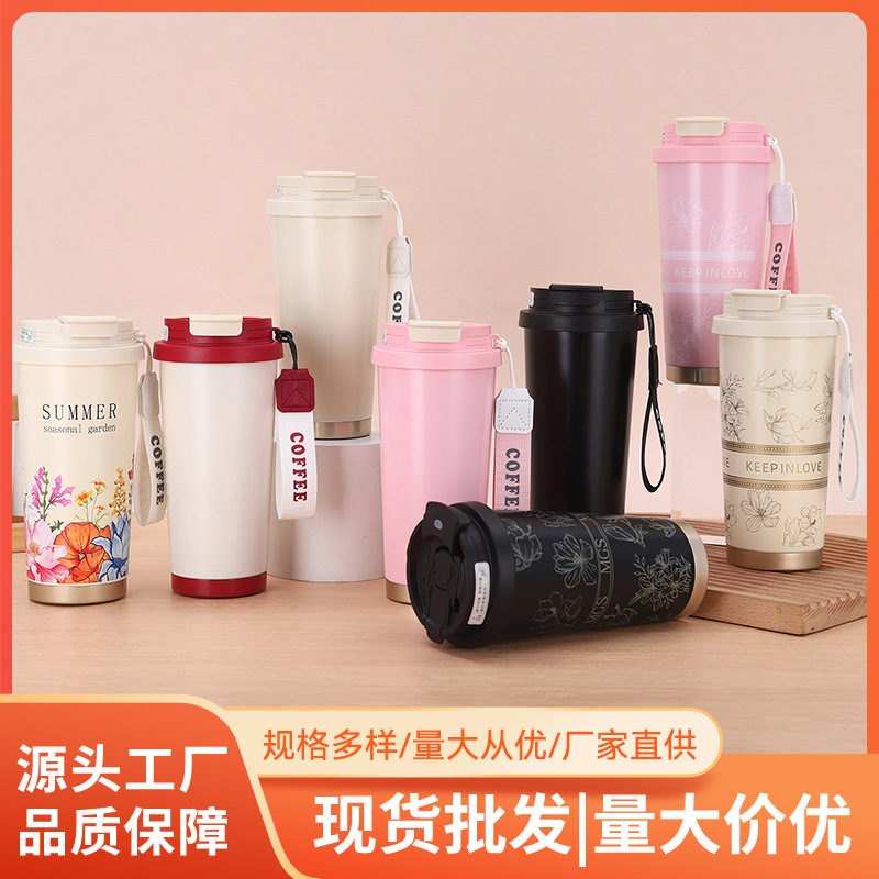 新款铃兰花316不锈钢保温杯户外提绳吸管咖啡杯双层便携礼品水杯