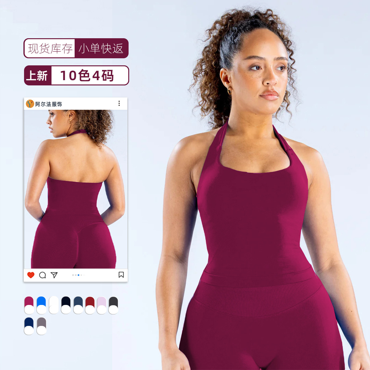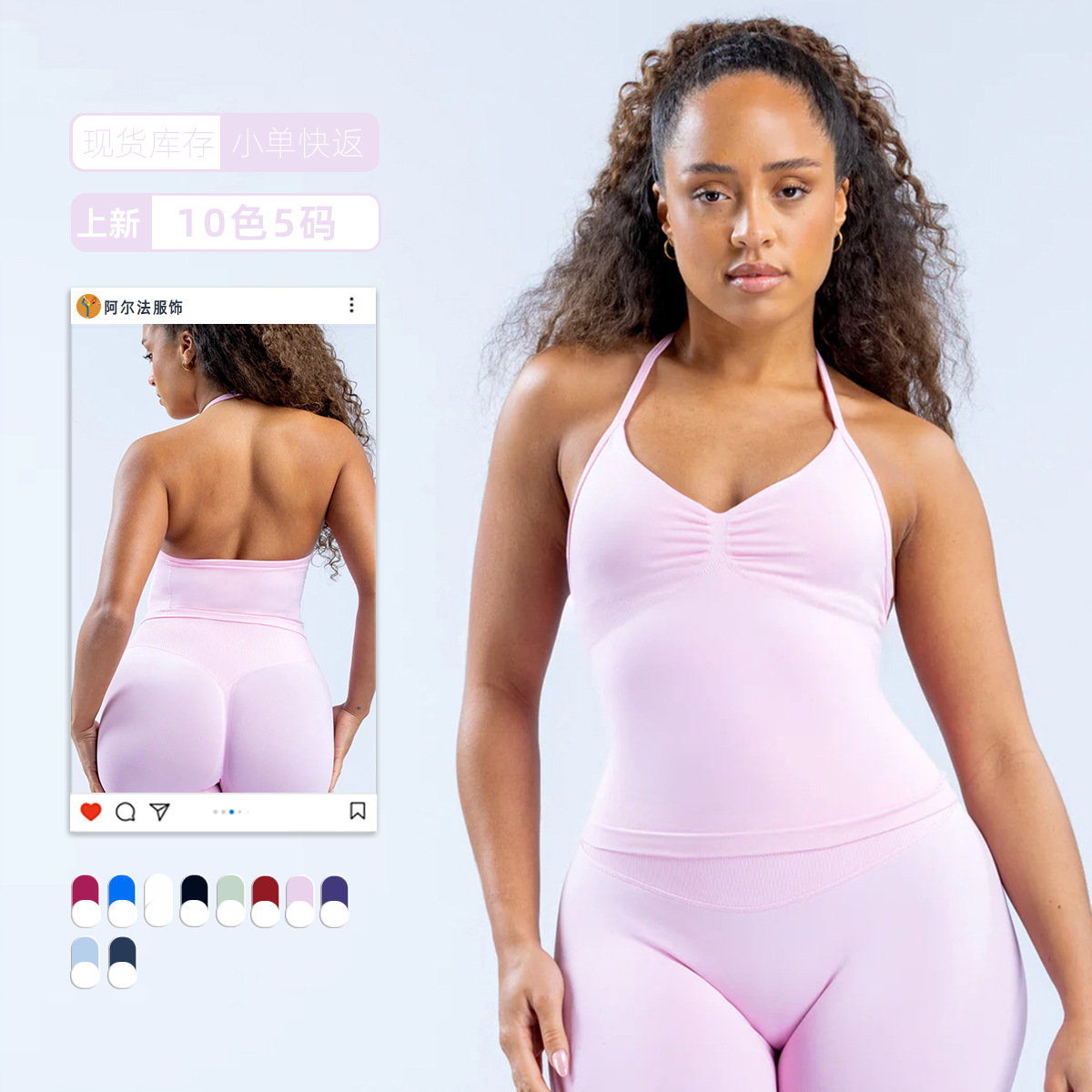 阿尔法新款欧美跨境无缝瑜伽露背挂脖运动背心塑身防走光女生背心