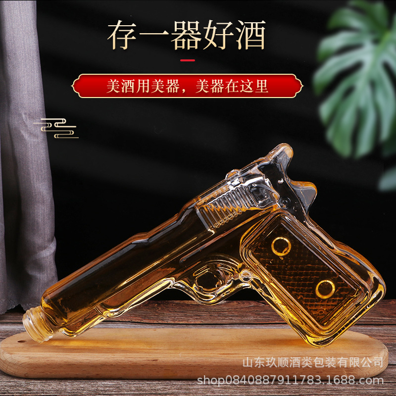 定制厂家生产新款晶白料手枪型玻璃瓶威士忌滗水器醒酒器办公摆件