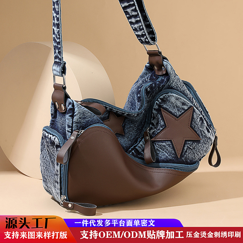 复古牛仔撞色包包 五角星立体装饰 ins潮腋下包 跨境爆款女包代发