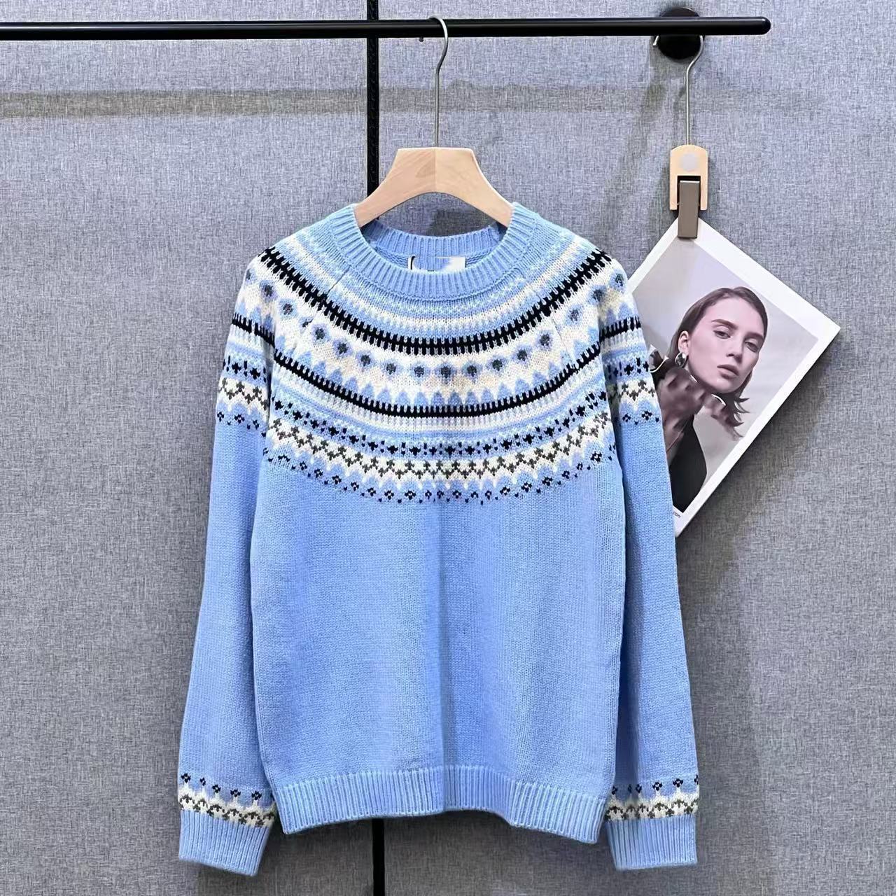 深圳南油高定MM家25秋冬新款蓝色提花针织衫复古圆领套头毛衣