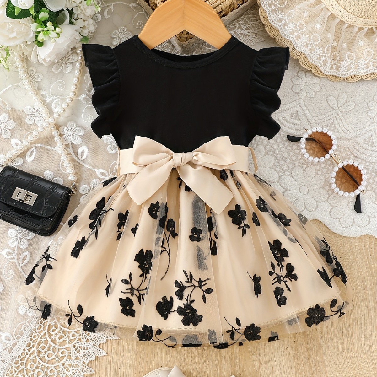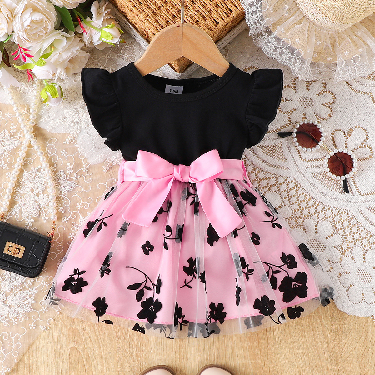 夏季女童洋气飞袖裙 黑粉撞色网纱绣花裙 蝴蝶结收腰儿童可爱裙子
