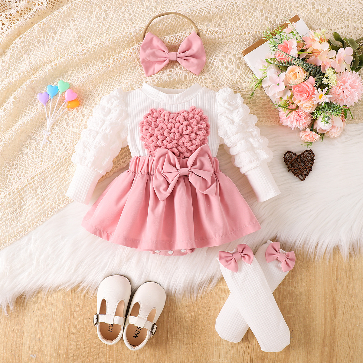 甜美爱心三角连体衣 白色泡泡袖粉色大蝴蝶结发箍袜子婴儿公主裙