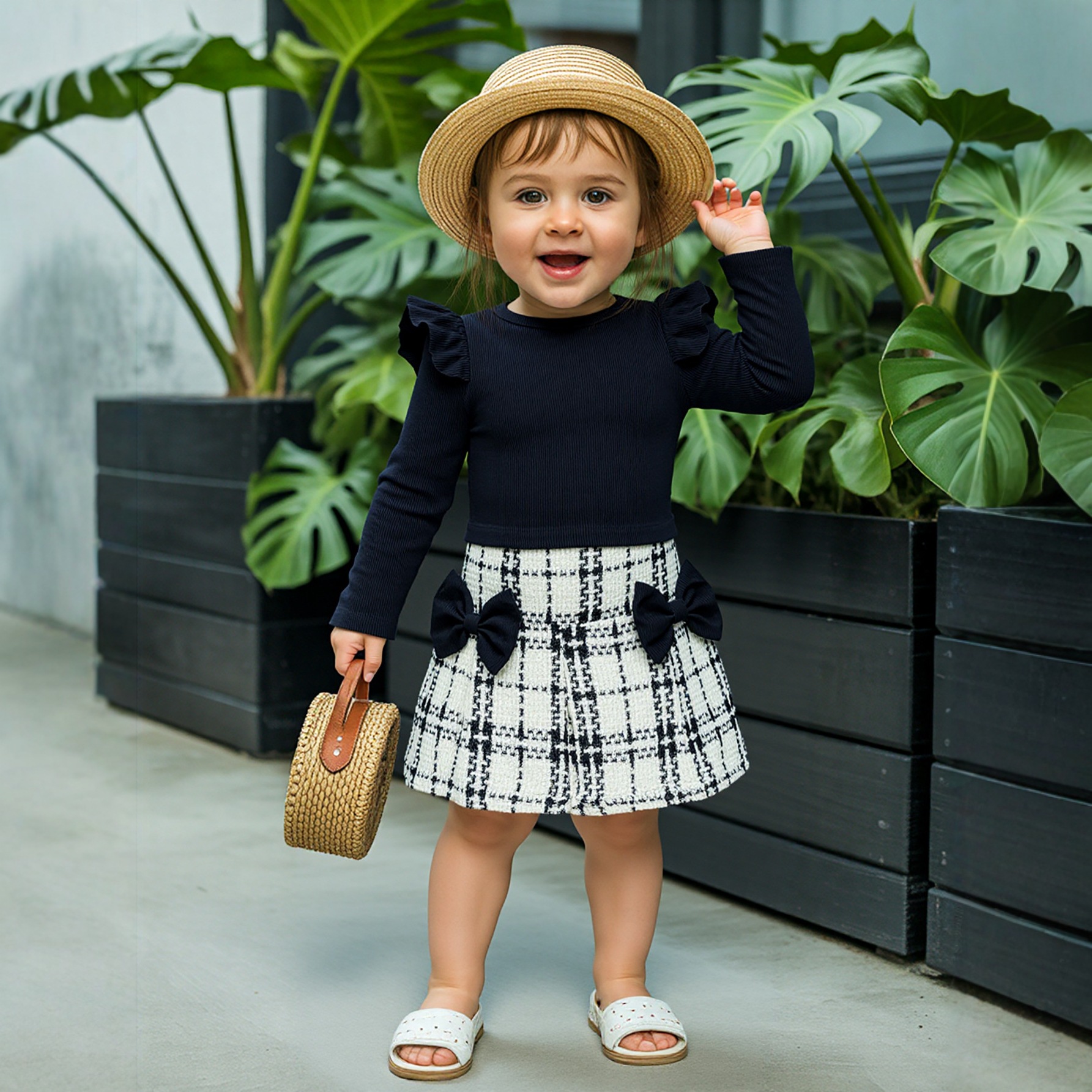 欧美风女童秋冬新款格子裙套装长袖上衣两件套