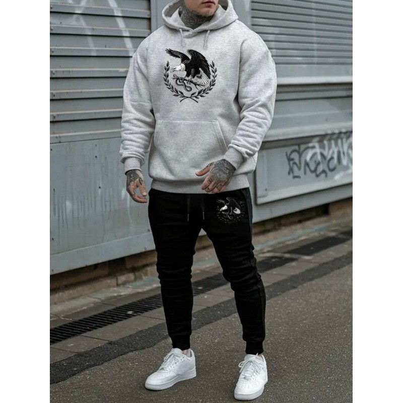 2025外贸亚马逊秋冬百搭男装卫衣拼色连帽衫裤子时尚休闲运动套装